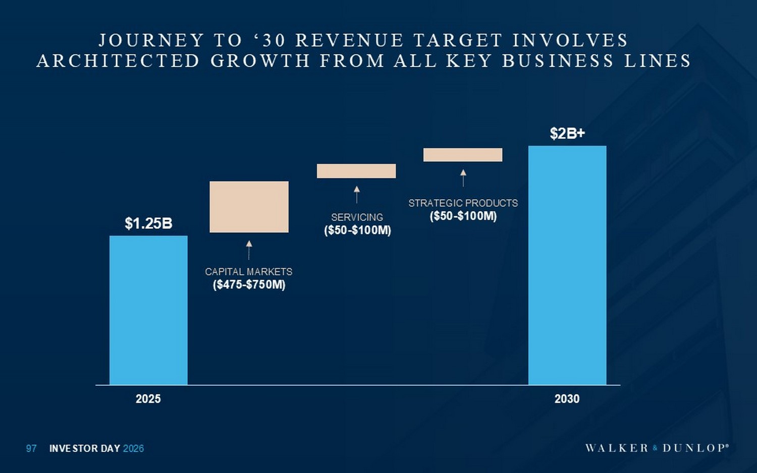 INVESTOR DAY 2026 EXPANDING BEYOND MULTIFAMILY UNLOCKS SIGNIFICANT GROWTH OPPORTUNITY ? Source (for historical and 2026 forecast origination volumes): Mortgage Bankers Association (MBA) Annual Originations Summati on Report and MBA CREF Forecast. Source (for 2030 forecast origination volumes) Walker & Dunlop Assumptions. Non - m ultifamily represents around 40 – 50% of the total lending market . Total Commercial Loan Originations (in billions) $602 $614 $891 $816 $429 $498 $634 $805 $840 2019 2020 2021 2022 2023 2024 2025 2026 Forecast 2030 Forecast Non-Multifamily Volume Mutifamily Volume 2% Market Share 63