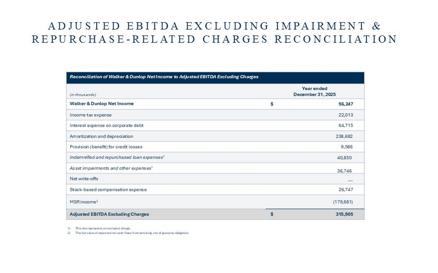 ADJUSTED EBITDA EXCLUDING IMPAIRMENT & REPURCHASE - RELATED CHARGES RECONCILIATION Reconciliation of Walker & Dunlop Net Income to Adjusted EBITDA Excluding Charges Year ended December 31, 2025 (in thousands) 56,247 $ Walker & Dunlop Net Income 22,013 Income tax expense 64,715 Interest expense on corporate debt 238,682 Amortization and depreciation 9,586 Provision (benefit) for credit losses 40,850 Indemnified and repurchased loan expenses 1 36,746 Asset impairments and other expenses 1 __ Net write - offs 26,747 Stock - based compensation expense (179,681) MSR income 2 315,905 $ Adjusted EBITDA Excluding Charges 1) This line represents an excluded charge. 2) T he fair value of expected net cash flows from servicing, net of guaranty obligation .