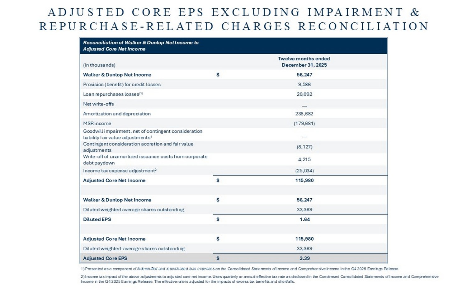 ADJUSTED CORE EPS EXCLUDING IMPAIRMENT & REPURCHASE - RELATED CHARGES RECONCILIATION Reconciliation of Walker & Dunlop Net Income to Adjusted Core Net Income Twelve months ended December 31, 2025 (in thousands) 56,247 $ Walker & Dunlop Net Income 9,586 Provision (benefit) for credit losses 20,092 Loan repurchases losses (1) __ Net write - offs 238,682 Amortization and depreciation (179,681) MSR income __ Goodwill impairment, net of contingent consideration liability fair value adjustments 1 (8,127) Contingent consideration accretion and fair value adjustments 4,215 Write - off of unamortized issuance costs from corporate debt paydown (25,034) Income tax expense adjustment 2 115,980 $ Adjusted Core Net Income 56,247 $ Walker & Dunlop Net Income 33,369 Diluted weighted average shares outstanding 1.64 $ Diluted EPS 115,980 $ Adjusted Core Net Income 33,369 Diluted weighted - average shares outstanding 3.39 $ Adjusted Core EPS 1) Presented as a component of Indemnified and repurchased loan expenses on the Consolidated Statements of Income and Comprehensive Income in the Q4 2025 Earnings Release. 2) Income tax impact of the above adjustments to adjusted core net income. Uses quarterly or annual effective tax rate as dis clo sed in the Condensed Consolidated Statements of Income and Comprehensive Income in the Q4 2025 Earnings Release. The effective rate is adjusted for the impacts of excess tax benefits and shortfalls.