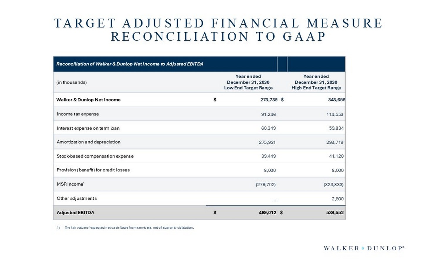 TARGET ADJUSTED FINANCIAL MEASURE RECONCILIATION TO GAAP Reconciliation of Walker & Dunlop Net Income to Adjusted EBITDA Year ended December 31, 2030 High End Target Range Year ended December 31, 2030 Low End Target Range (in thousands) 343,659 $ 273,739 $ Walker & Dunlop Net Income 114,553 91,246 Income tax expense 59,834 60,349 Interest expense on term loan 293,719 275,931 Amortization and depreciation 41,120 39,449 Stock - based compensation expense 8,000 8,000 Provision (benefit) for credit losses (323,833) (279,702) MSR income 1 2,500 _ Other adjustments 539,552 $ 469,012 $ Adjusted EBITDA 1) T he fair value of expected net cash flows from servicing, net of guaranty obligation.