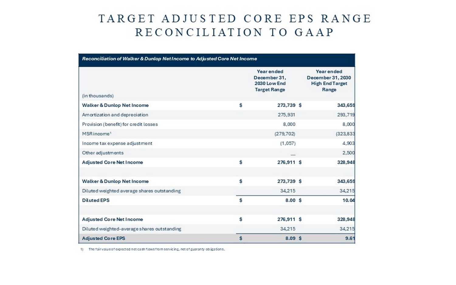 TARGET ADJUSTED CORE EPS RANGE RECONCILIATION TO GAAP Reconciliation of Walker & Dunlop Net Income to Adjusted Core Net Income Year ended December 31, 2030 High End Target Range Year ended December 31, 2030 Low End Target Range (in thousands) 343,659 $ 273,739 $ Walker & Dunlop Net Income 293,719 275,931 Amortization and depreciation 8,000 8,000 Provision (benefit) for credit losses (323,833 (279,702) MSR income 1 4,903 (1,057) Income tax expense adjustment 2,500 __ Other adjustments 328,948 $ 276,911 $ Adjusted Core Net Income 343,659 $ 273,739 $ Walker & Dunlop Net Income 34,215 34,215 Diluted weighted average shares outstanding 10.04 $ 8.00 $ Diluted EPS 328,948 $ 276,911 $ Adjusted Core Net Income 34,215 34,215 Diluted weighted - average shares outstanding 9.61 $ 8.09 $ Adjusted Core EPS 1) T he fair value of expected net cash flows from servicing, net of guaranty obligations.