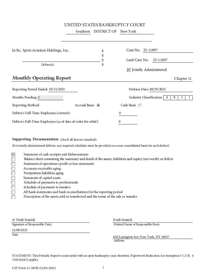 UNITED STATES BANKRUPTCY COURT Southern DISTRICT OF New York In Re. Spirit Aviation Holdings, Inc. D e bt o r ( s ) † † † † Case No. 25 - 11897 Lead Case No. 25 - 11897 Jointly Administered Monthly Operating Report Chapter 11 Reporting Period Ended: 10/31/2025 Petition Date: 08/29/2025 Months Pending: 2 1 1 8 4 Industry Classification: Reporting Method: Accrual Basis Cash Basis Debtor's Full - Time Employees (current): 0 Debtor's Full - Time Employees (as of date of order for relief): 0 Supporting Documentation (check all that are attached): (For jointly administered debtors, any required schedules must be provided on a non - consolidated basis for each debtor) Statement of cash receipts and disbursements Balance sheet containing the summary and detail of the assets, liabilities and equity (net worth) or deficit Statement of operations (profit or loss statement) Accounts receivable aging Postpetition liabilities aging Statement of capital assets Schedule of payments to professionals Schedule of payments to insiders All bank statements and bank reconciliations for the reporting period Description of the assets sold or transferred and the terms of the sale or transfer Printed Name of Responsible Party Dat e /s/ Noah Sosnick Signature of Responsible Party 1 2/ 0 8/ 2025 Noah Sosnick 1 UST Form 11 - MOR (12/01/2021) 450 Lexington Ave New York, NY 10017 Address STATEMENT: This Periodic Report is associated with an open bankruptcy case; therefore, Paperwork Reduction Act exemption 5 C.F.R. † 1320.4(a)(2) applies.