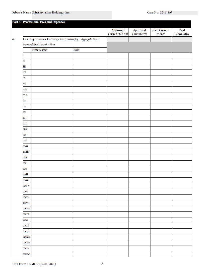 3 UST Form 11 - MOR (12/01/2021) Debtor's Name Spirit Aviation Holdings, Inc. Case No. 25 - 11897 Part 5: Professional Fees and Expenses Paid Cumulative Paid Current Month Approved Cumulative Approved Current Month a. Debtor's professional fees & expenses (bankruptcy) Aggregate Total Itemized Breakdown by Firm Role Firm Name i ii iii iv v vi vii viii ix x xi xii xiii xiv xv xvi xvii xviii xix xx xxi xxii xxiii xxiv xxv xxvi xxvii xxviii xxix xxx xxxi xxxii xxxiii xxxiv xxxv xxxvi