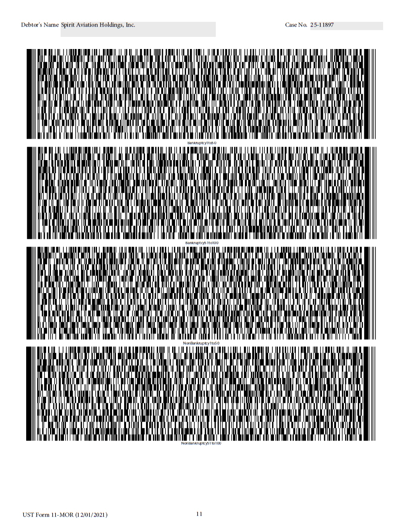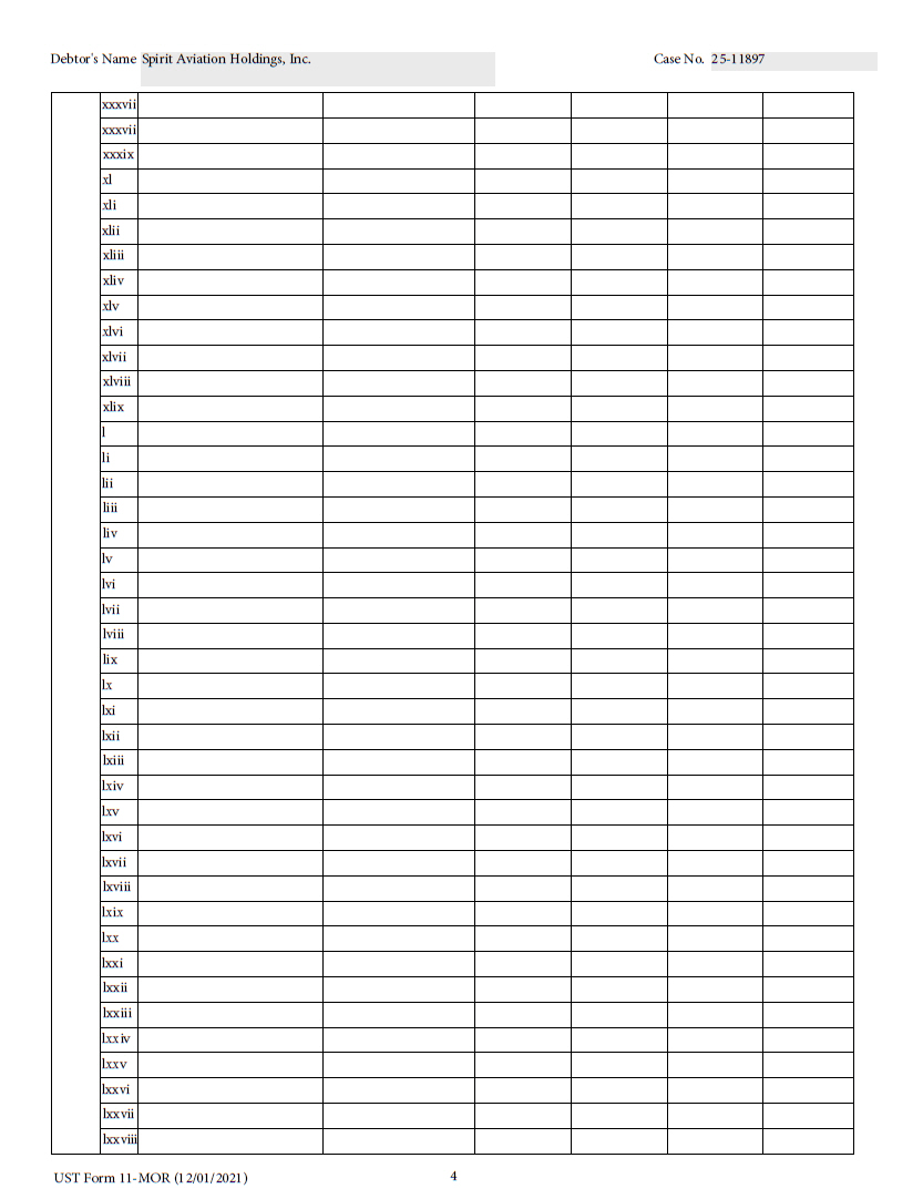 4 UST Form 11 - MOR (12/01/2021) Debtor's Name Spirit Aviation Holdings, Inc. Case No. 25 - 11897 xxxvii xxxvii xxxix xl xli xlii xliii xliv xlv xlvi xlvii xlviii xlix l li lii liii liv lv lvi lvii lviii lix lx lxi lxii lxiii lxiv lxv lxvi lxvii lxviii lxix lxx lxxi lxxii lxxiii lxxiv lxxv lxxvi lxxvii lxxviii