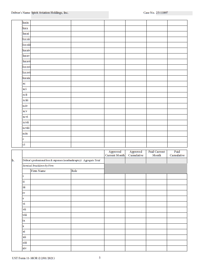 5 UST Form 11 - MOR (12/01/2021) Debtor's Name Spirit Aviation Holdings, Inc. Case No. 25 - 11897 lxxix lxxx lxxxi lxxxii lxxxiii lxxxiv lxxxv lxxxvi lxxxvi lxxxvi lxxxix xc xci xcii xciii xciv xcv xcvi xcvii xcviii xcix c ci Paid Cumulative Paid Current Month Approved Cumulative Approved Current Month b. Debtor's professional fees & expenses (nonbankruptcy) Aggregate Total Itemized Breakdown by Firm Role Firm Name i ii iii iv v vi vii viii ix x xi xii xiii xiv