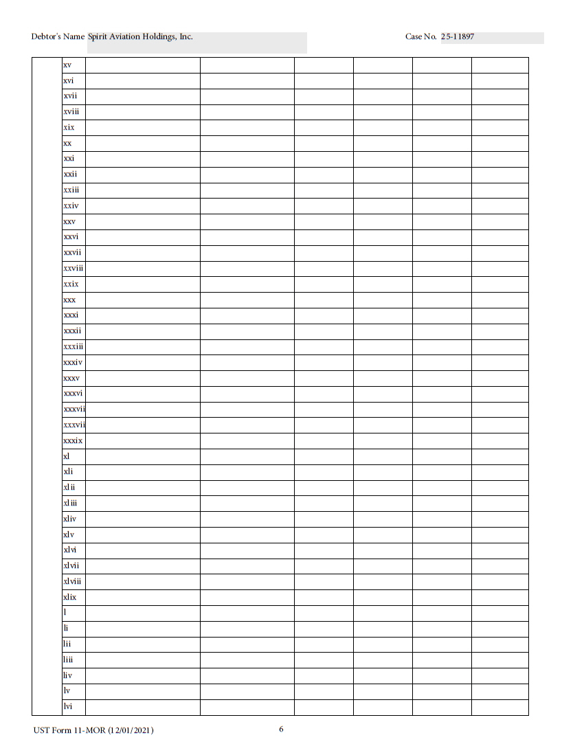 6 UST Form 11 - MOR (12/01/2021) Debtor's Name Spirit Aviation Holdings, Inc. Case No. 25 - 11897 xv xvi xvii xviii xix xx xxi xxii xxiii xxiv xxv xxvi xxvii xxviii xxix xxx xxxi xxxii xxxiii xxxiv xxxv xxxvi xxxvii xxxvii xxxix xl xli xlii xliii xliv xlv xlvi xlvii xlviii xlix l li lii liii liv lv lvi