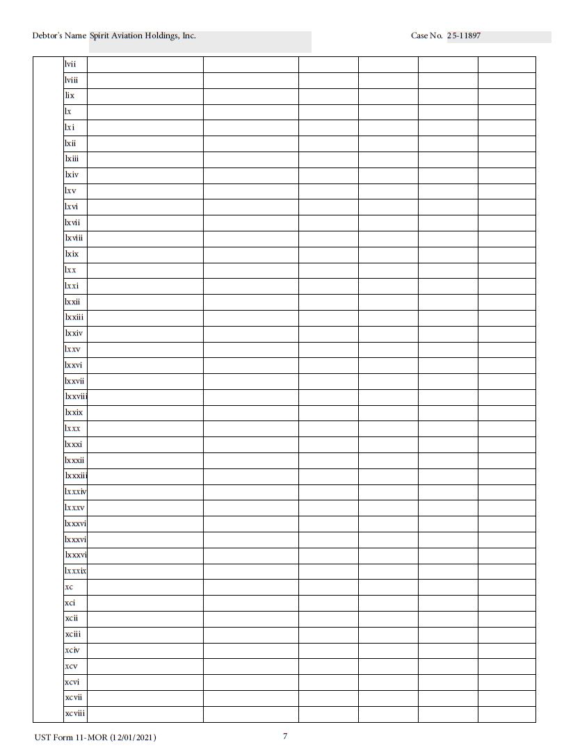 7 UST Form 11 - MOR (12/01/2021) Debtor's Name Spirit Aviation Holdings, Inc. Case No. 25 - 11897 lvii lviii lix lx lxi lxii lxiii lxiv lxv lxvi lxvii lxviii lxix lxx lxxi lxxii lxxiii lxxiv lxxv lxxvi lxxvii lxxviii lxxix lxxx lxxxi lxxxii lxxxiii lxxxiv lxxxv lxxxvi lxxxvi lxxxvi lxxxix xc xci xcii xciii xciv xcv xcvi xcvii xcviii
