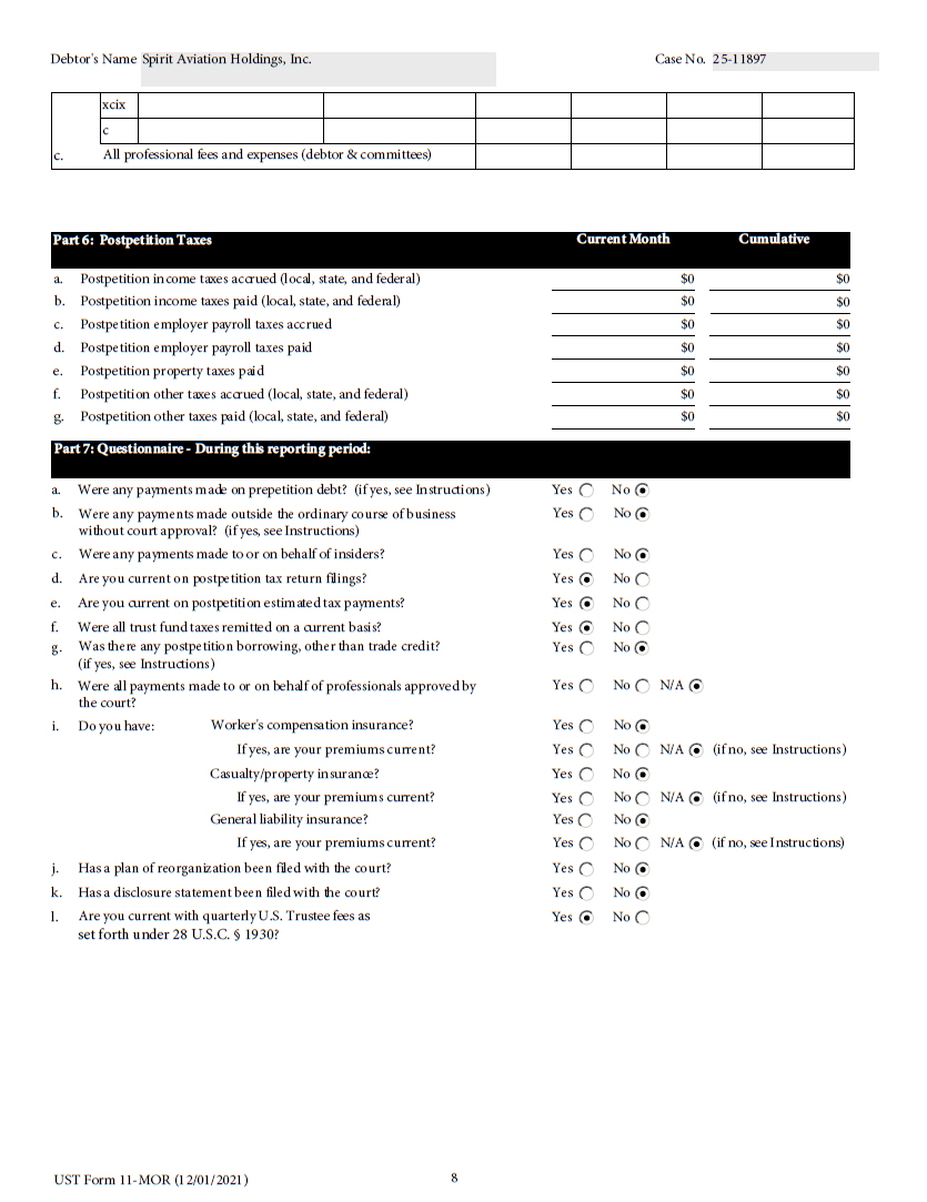 Debtor's Name Spirit Aviation Holdings, Inc. Case No. 25 - 11897 xcix c c. All professional fees and expenses (debtor & committees) Part 6: Postpetition Taxes Current Month Cumulative $0 $0 a. Postpetition income taxes accrued (local, state, and federal) $0 $0 b. Postpetition income taxes paid (local, state, and federal) $0 $0 c. Postpetition employer payroll taxes accrued $0 $0 d. Postpetition employer payroll taxes paid $0 $0 e. Postpetition property taxes paid $0 $0 f. Postpetition other taxes accrued (local, state, and federal) $0 $0 g. Postpetition other taxes paid (local, state, and federal) Part 7: Questionnaire - During this reporting period: Y es Y es No No Y es Y es Y es Y es Y es No No No No No a. Were any payments made on prepetition debt? (if yes, see Instructions) b. Were any payments made outside the ordinary course of business without court approval? (if yes, see Instructions) c. Were any payments made to or on behalf of insiders? d. Are you current on postpetition tax return filings? e. Are you current on postpetition estimated tax payments? f. Were all trust fund taxes remitted on a current basis? g. Was there any postpetition borrowing, other than trade credit? (if yes, see Instructions) h. Were all payments made to or on behalf of professionals approved by the court? Y es No N / A i. Do you have: N / A (if no, see Instructions) N/A (if no, see Instructions) Worker's compensation insurance? If yes, are your premiums current? Casualty/property insurance? If yes, are your premiums current? General liability insurance? If yes, are your premiums current? j. Has a plan of reorganization been filed with the court? k. Has a disclosure statement been filed with the court? l. Are you current with quarterly U.S. Trustee fees as set forth under 28 U.S.C. † 1930 ? Y es Y es Y es Y es Y es Y es Y es Y es Y es No No N/A (if no, see Instructions) No No No No No No No 8 UST Form 11 - MOR (12/01/2021)
