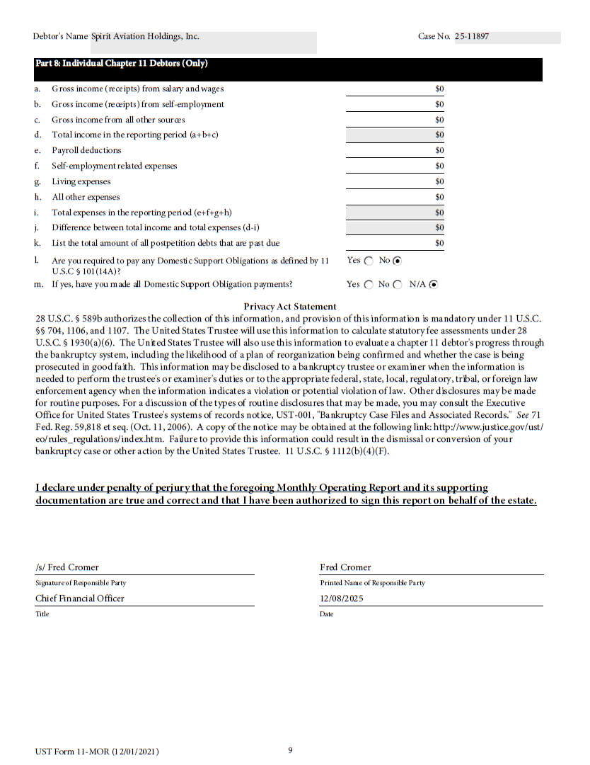 Debtor's Name Spirit Aviation Holdings, Inc. Case No. 25 - 11897 Part 8: Individual Chapter 11 Debtors (Only) $0 $0 $0 $0 $0 $0 $0 $0 $0 $0 $0 Y e s No N / A a. Gross income (receipts) from salary and wages b. Gross income (receipts) from self - employment c. Gross income from all other sources d. Total income in the reporting period (a+b+c) e. Payroll deductions f. Self - employment related expenses g. Living expenses h. All other expenses i. Total expenses in the reporting period (e+f+g+h) j. Difference between total income and total expenses (d - i) k. List the total amount of all postpetition debts that are past due l. A r e y o u r e q ui r ed t o p a y a ny D o m e s t i c S upp o r t O b lig a t i o n s a s d ef i n ed b y 1 1 Y e s No U.S.C † 101(14A)? m. If yes, have you made all Domestic Support Obligation payments? Privacy Act Statement 28 U.S.C. † 589b authorizes the collection of this information, and provision of this information is mandatory under 11 U.S.C. †† 704, 1106, and 1107. The United States Trustee will use this information to calculate statutory fee assessments under 28 U.S.C. † 1930(a)(6). The United States Trustee will also use this information to evaluate a chapter 11 debtor's progress through the bankruptcy system, including the likelihood of a plan of reorganization being confirmed and whether the case is being prosecuted in good faith. This information may be disclosed to a bankruptcy trustee or examiner when the information is needed to perform the trustee's or examiner's duties or to the appropriate federal, state, local, regulatory, tribal, or foreign law enforcement agency when the information indicates a violation or potential violation of law. Other disclosures may be made for routine purposes. For a discussion of the types of routine disclosures that may be made, you may consult the Executive Office for United States Trustee's systems of records notice, UST - 001, "Bankruptcy Case Files and Associated Records." See 71 Fed. Reg. 59,818 et seq. (Oct. 11, 2006). A copy of the notice may be obtained at the following link: http://www.justice.gov/ust/ eo/rules_regulations/index.htm. Failure to provide this information could result in the dismissal or conversion of your bankruptcy case or other action by the United States Trustee. 11 U.S.C. † 1112(b)(4)(F). I declare under penalty of perjury that the foregoing Monthly Operating Report and its supporting documentation are true and correct and that I have been authorized to sign this report on behalf of the estate. /s/ Fred Cromer Signature of Responsible Party Chief Financial Officer Printed Name of Responsible Party 12/08/2025 Date T i t le Fred Cromer 9 UST Form 11 - MOR (12/01/2021)