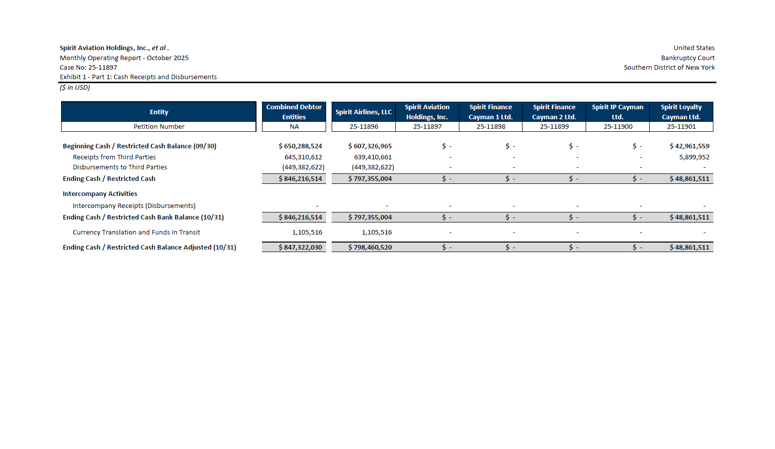 Beginning Cash / Restricted Cash Balance (09/30) Receipts from Third Parties Disbursements to Third Parties Ending Cash / Restricted Cash Intercompany Activities Intercompany Receipts (Disbursements) Ending Cash / Restricted Cash Bank Balance (10/31) Currency Translation and Funds in Transit 1 , 105 , 516 - - - - - 1,105,516 $ 650,288,524 645 , 310 , 612 (449 , 382 , 622) $ 846,216,514 - $ 846,216,514 Ending Cash / Restricted Cash Balance Adjusted (10/31) $ 847,322,030 Entity Petition Number Combined Debtor Entities NA Spirit Aviation Holdings, Inc., et al . United States Monthly Operating Report - October 2025 Bankruptcy Court Case No: 25 - 11897 Southern District of New York Exhibit 1 - Part 1: Cash Receipts and Disbursements ($ in USD) Spirit Loyalty Cayman Ltd. Spirit IP Cayman Ltd. Spirit Finance Cayman 2 Ltd. Spirit Finance Cayman 1 Ltd. Spirit Aviation Holdings, Inc. Spirit Airlines, LLC 25 - 11901 25 - 11900 25 - 11899 25 - 11898 25 - 11897 25 - 11896 $ 42,961,559 $ - $ - $ - $ - $ 607,326,965 5 , 899 , 952 - - - - 639,410,661 - - - - - (449,382,622) $ 48,861,511 $ - $ - $ - $ - $ 797,355,004 - - - - - - $ 48,861,511 $ - $ - $ - $ - $ 797,355,004 $ 48,861,511 $ - $ - $ - $ - $ 798,460,520