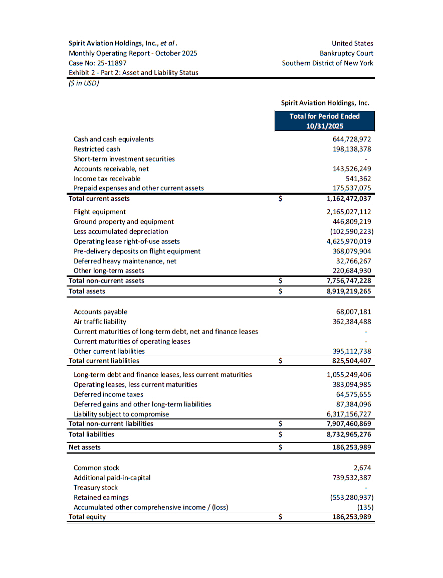 United States Spirit Aviation Holdings, Inc., et al . Bankruptcy Court Monthly Operating Report - October 2025 Southern District of New York Case No: 25 - 11897 Exhibit 2 - Part 2: Asset and Liability Status ($ in USD) Total for Period Ended 10/31/2025 644 , 728 , 972 Cash and cash equivalents 198 , 138 , 378 Restricted cash - Short - term investment securities 143 , 526 , 249 Accounts receivable, net 541 , 362 Income tax receivable 175 , 537 , 075 Prepaid expenses and other current assets $ 1 , 162 , 472 , 037 Total current assets Spirit Aviation Holdings, Inc. 2 , 165 , 027 , 112 Flight equipment 446 , 809 , 219 Ground property and equipment ( 102 , 590 , 223) Less accumulated depreciation 4 , 625 , 970 , 019 Operating lease right - of - use assets 368 , 079 , 904 Pre - delivery deposits on flight equipment 32 , 766 , 267 Deferred heavy maintenance, net 220 , 684 , 930 Other long - term assets $ 7 , 756 , 747 , 228 Total non - current assets $ 8 , 919 , 219 , 265 Total assets 68 , 007 , 181 Accounts payable 362 , 384 , 488 Air traffic liability - Current maturities of long - term debt, net and finance leases - Current maturities of operating leases 395 , 112 , 738 Other current liabilities $ 825 , 504 , 407 Total current liabilities 1 , 055 , 249 , 406 Long - term debt and finance leases, less current maturities 383 , 094 , 985 Operating leases, less current maturities 64 , 575 , 655 Deferred income taxes 87 , 384 , 096 Deferred gains and other long - term liabilities 6 , 317 , 156 , 727 Liability subject to compromise 7 , 907 , 460 , 869 $ Total non - current liabilities 8 , 732 , 965 , 276 $ Total liabilities 186 , 253 , 989 $ Net assets 2 , 674 Common stock 739 , 532 , 387 Additional paid - in - capital - Treasury stock ( 553 , 280 , 937) Retained earnings ( 135) Accumulated other comprehensive income / (loss) $ 186 , 253 , 989 Total equity
