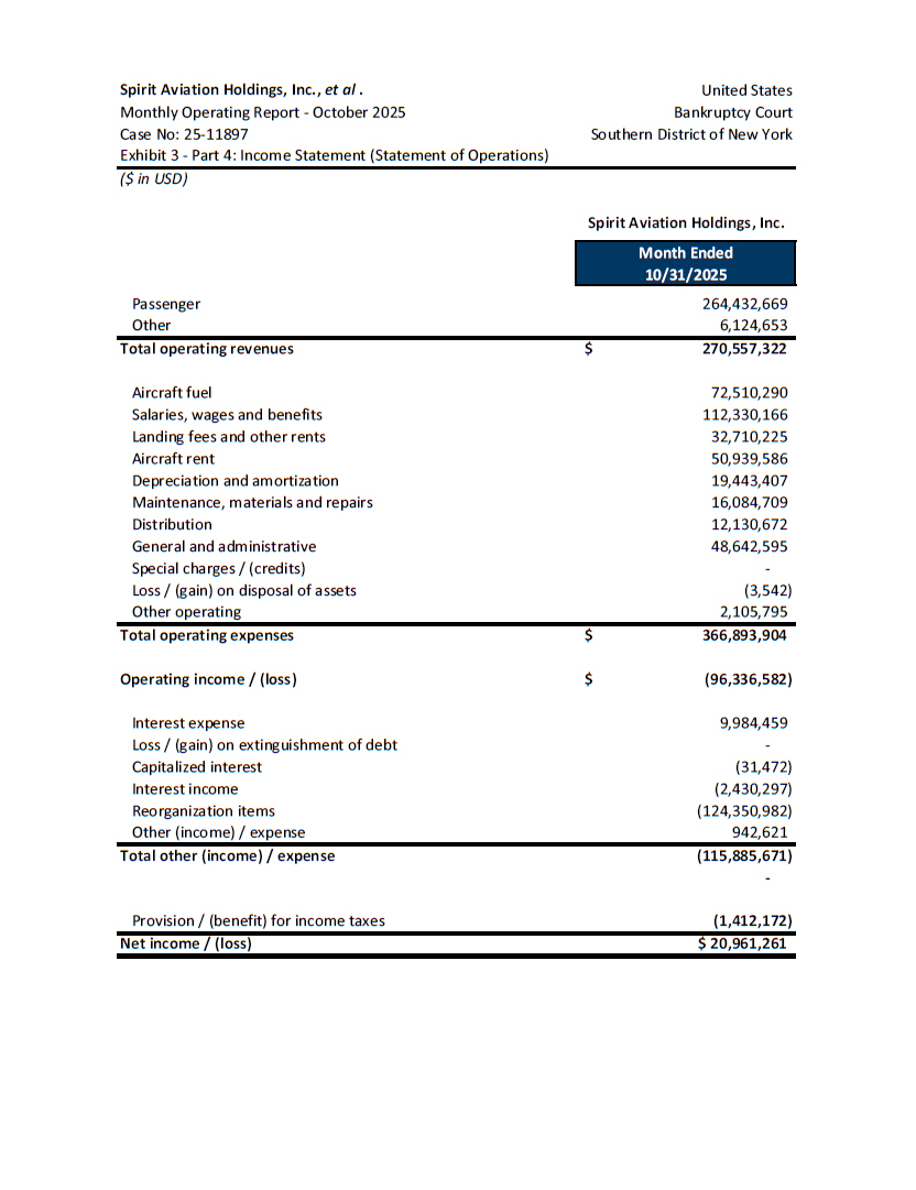 Spirit Aviation Holdings, Inc. Month Ended 10/31/2025 $ (96,336,582) Operating income / (loss) United States Spirit Aviation Holdings, Inc., et al . Bankruptcy Court Monthly Operating Report - October 2025 Southern District of New York Case No: 25 - 11897 Exhibit 3 - Part 4: Income Statement (Statement of Operations) ($ in USD) 264,432,669 Passenger 6,124,653 Other $ 270,557,322 Total operating revenues 72,510,290 Aircraft fuel 112,330,166 Salaries, wages and benefits 32,710,225 Landing fees and other rents 50,939,586 Aircraft rent 19,443,407 Depreciation and amortization 16,084,709 Maintenance, materials and repairs 12,130,672 Distribution 48,642,595 General and administrative - Special charges / (credits) (3,542) Loss / (gain) on disposal of assets 2,105,795 Other operating $ 366,893,904 Total operating expenses 9,984,459 Interest expense - Loss / (gain) on extinguishment of debt (31,472) Capitalized interest (2,430,297) Interest income (124,350,982) Reorganization items 942,621 Other (income) / expense (115,885,671) Total other (income) / expense - (1,412,172) Provision / (benefit) for income taxes $ 20,961,261 Net income / (loss)