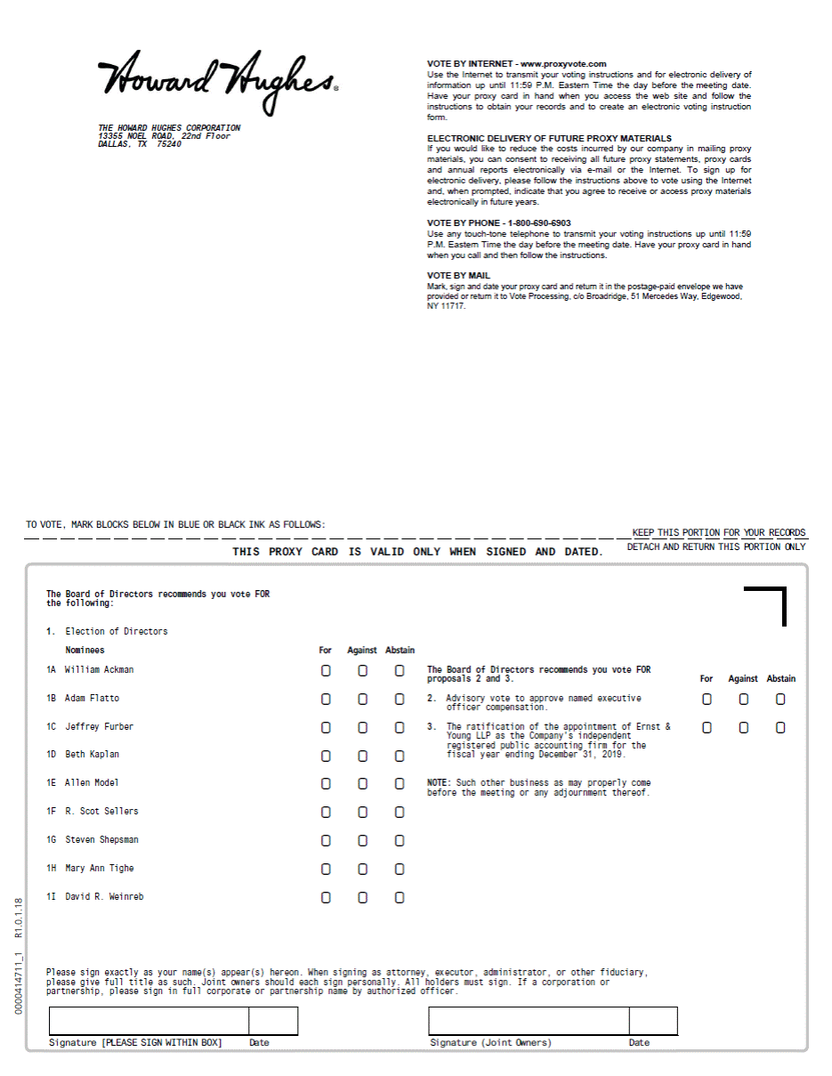 VOTE BY INTERNET - www.proxyvote.com Use the Internet to transmit your voting instructions and for electronic delivery of information up until 11:59 P.M. Eastern Time the day before the meeting date. Have your proxy card in hand when you access the web site and follow the instructions to obtain your records and to create an electronic voting instruction form. THE HOWARD HUGHES CORPORATION 13355 NOEL ROAD, 22nd Floor DALLAS, TX 75240 ELECTRONIC DELIVERY OF FUTURE PROXY MATERIALS If you would like to reduce the costs incurred by our company in mailing proxy materials, you can consent to receiving all future proxy statements, proxy cards and annual reports electronically via e-mail or the Internet. To sign up for electronic delivery, please follow the instructions above to vote using the Internet and, when prompted, indicate that you agree to receive or access proxy materials electronically in future years. VOTE BY PHONE - 1-800-690-6903 Use any touch-tone telephone to transmit your voting instructions up until 11:59 P.M. Eastern Time the day before the meeting date. Have your proxy card in hand when you call and then follow the instructions. VOTE BY MAIL Mark, sign and date your proxy card and return it in the postage-paid envelope we have provided or return it to Vote Processing, c/o Broadridge, 51 Mercedes Way, Edgewood, NY 11717. TO VOTE, MARK BLOCKS BELOW IN BLUE OR BLACK INK AS FOLLOWS: KEEP THIS PORTION FOR YOUR RECORDS DETACH AND RETURN THIS PORTION ONLY THIS PROXY CARD IS VALID ONLY WHEN SIGNED AND DATED. The Board of Directors recommends you vote FOR the following: 1. Election of Directors Nominees William Ackman For 0 0 0 0 0 0 0 0 0 Against 0 0 0 0 0 0 0 0 0 Abstain 0 0 0 0 0 0 0 0 0 1A The Board of Directors recommends you vote FOR proposals 2 and 3. For 0 0 Against 0 0 Abstain 0 0 1B Adam Flatto 2. Advisory vote to approve named executive officer compensation. The ratification of the appointment of Ernst & Young LLP as the Company's independent registered public accounting firm for the fiscal year ending December 31, 2019. 1C Jeffrey Furber 3. 1D Beth Kaplan 1E Allen Model NOTE: Such other business as may properly come before the meeting or any adjournment thereof. 1F R. Scot Sellers 1G Steven Shepsman 1H Mary Ann Tighe 1I David R. Weinreb Please sign exactly as your name(s) appear(s) hereon. When signing as attorney, executor, administrator, or other fiduciary, please give full title as such. Joint owners should each sign personally. All holders must sign. If a corporation or partnership, please sign in full corporate or partnership name by authorized officer. Signature [PLEASE SIGN WITHIN BOX] Date Signature (Joint Owners) Date 0000414711_1 R1.0.1.18