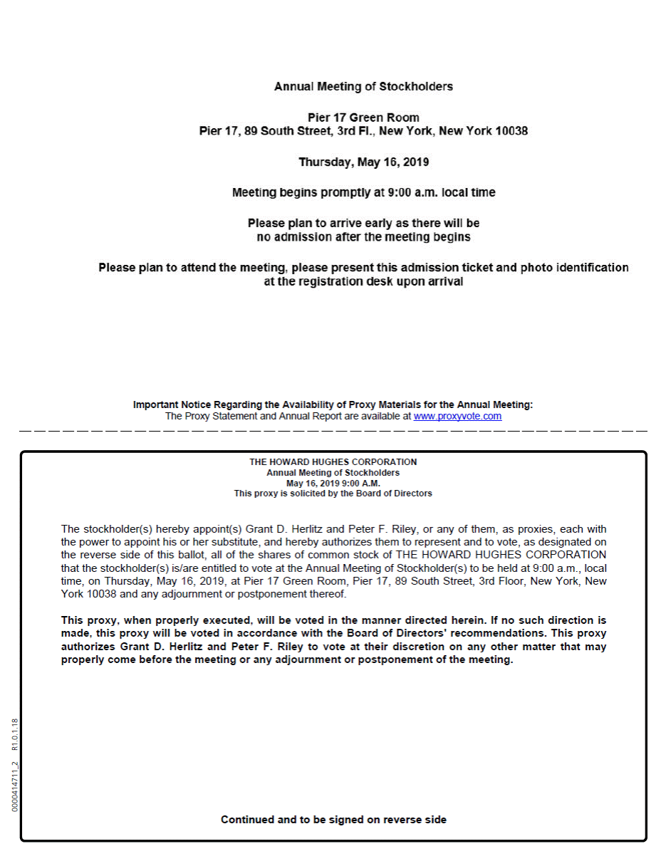 Important Notice Regarding the Availability of Proxy Materials for the Annual Meeting: The Proxy Statement and Annual Report are available at www.proxyvote.com THE HOWARD HUGHES CORPORATION Annual Meeting of Stockholders May 16, 2019 9:00 A.M. This proxy is solicited by the Board of Directors The stockholder(s) hereby appoint(s) Grant D. Herlitz and Peter F. Riley, or any of them, as proxies, each with the power to appoint his or her substitute, and hereby authorizes them to represent and to vote, as designated on the reverse side of this ballot, all of the shares of common stock of THE HOWARD HUGHES CORPORATION that the stockholder(s) is/are entitled to vote at the Annual Meeting of Stockholder(s) to be held at 9:00 a.m., local time, on Thursday, May 16, 2019, at Pier 17 Green Room, Pier 17, 89 South Street, 3rd Floor, New York, New York 10038 and any adjournment or postponement thereof. This proxy, when properly executed, will be voted in the manner directed herein. If no such direction is made, this proxy will be voted in accordance with the Board of Directors' recommendations. This proxy authorizes Grant D. Herlitz and Peter F. Riley to vote at their discretion on any other matter that may properly come before the meeting or any adjournment or postponement of the meeting. Continued and to be signed on reverse side 0000414711_2 R1.0.1.18