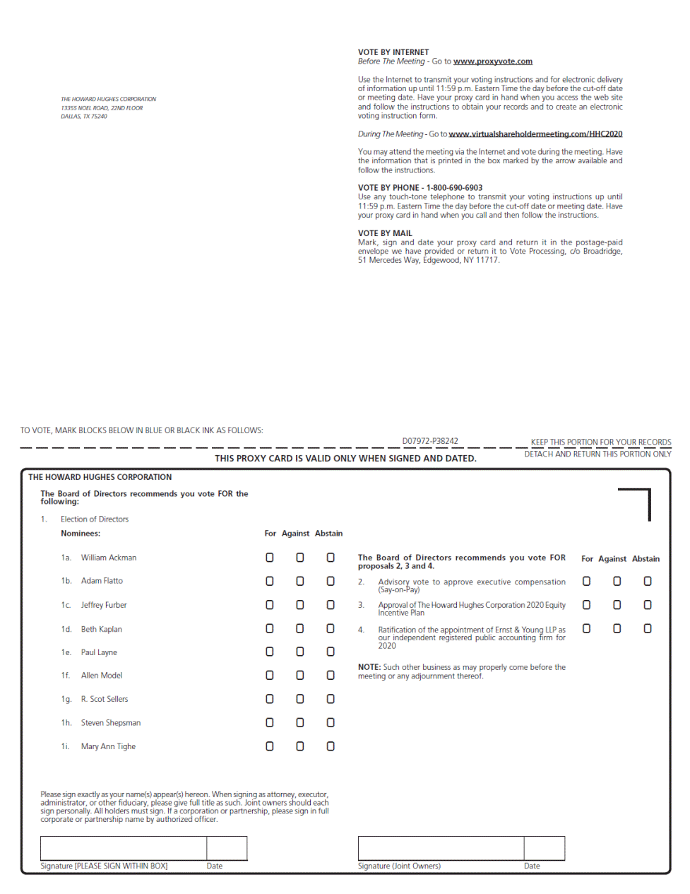 VOTE BY INTERNET Before The Meeting - Go to www.proxyvote.com Use the Internet to transmit your voting instructions and for electronic delivery of information up until 11:59 p.m. Eastern Time the day before the cut-off date or meeting date. Have your proxy card in hand when you access the web site and follow the instructions to obtain your records and to create an electronic voting instruction form. THE HOWARD HUGHES CORPORATION 13355 NOEL ROAD, 22ND FLOOR DALLAS, TX 75240 During The Meeting - Go to www.virtualshareholdermeeting.com/HHC2020 You may attend the meeting via the Internet and vote during the meeting. Have the information that is printed in the box marked by the arrow available and follow the instructions. VOTE BY PHONE - 1-800-690-6903 Use any touch-tone telephone to transmit your voting instructions up until 11:59 p.m. Eastern Time the day before the cut-off date or meeting date. Have your proxy card in hand when you call and then follow the instructions. VOTE BY MAIL Mark, sign and date your proxy card and return it in the postage-paid envelope we have provided or return it to Vote Processing, c/o Broadridge, 51 Mercedes Way, Edgewood, NY 11717. TO VOTE, MARK BLOCKS BELOW IN BLUE OR BLACK INK AS FOLLOWS: D07972-P38242 KEEP THIS PORTION FOR YOUR RECORDS DETACH AND RETURN THIS PORTION ONLY THIS PROXY CARD IS VALID ONLY WHEN SIGNED AND DATED. THE HOWARD HUGHES CORPORATION The Board of Directors recommends you vote FOR the following: 1. Election of Directors Nominees: For Against Abstain ! ! ! ! ! ! ! ! ! ! ! ! ! ! ! ! ! ! ! ! ! ! ! ! ! ! ! The Board of Directors recommends you vote FOR proposals 2, 3 and 4. 1a. William Ackman For Against Abstain ! ! ! ! ! ! ! ! ! 1b. Adam Flatto 2. Advisory vote to approve executive compensation (Say-on-Pay) Approval of The Howard Hughes Corporation 2020 Equity Incentive Plan 1c. Jeffrey Furber 3. 1d. Beth Kaplan 4. Ratification of the appointment of Ernst & Young LLP as our independent registered public accounting firm for 2020 1e. Paul Layne NOTE: Such other business as may properly come before the meeting or any adjournment thereof. 1f. Allen Model 1g. R. Scot Sellers 1h. Steven Shepsman 1i. Mary Ann Tighe Please sign exactly as your name(s) appear(s) hereon. When signing as attorney, executor, administrator, or other fiduciary, please give full title as such. Joint owners should each sign personally. All holders must sign. If a corporation or partnership, please sign in full corporate or partnership name by authorized officer. Signature [PLEASE SIGN WITHIN BOX] Date Signature (Joint Owners) Date