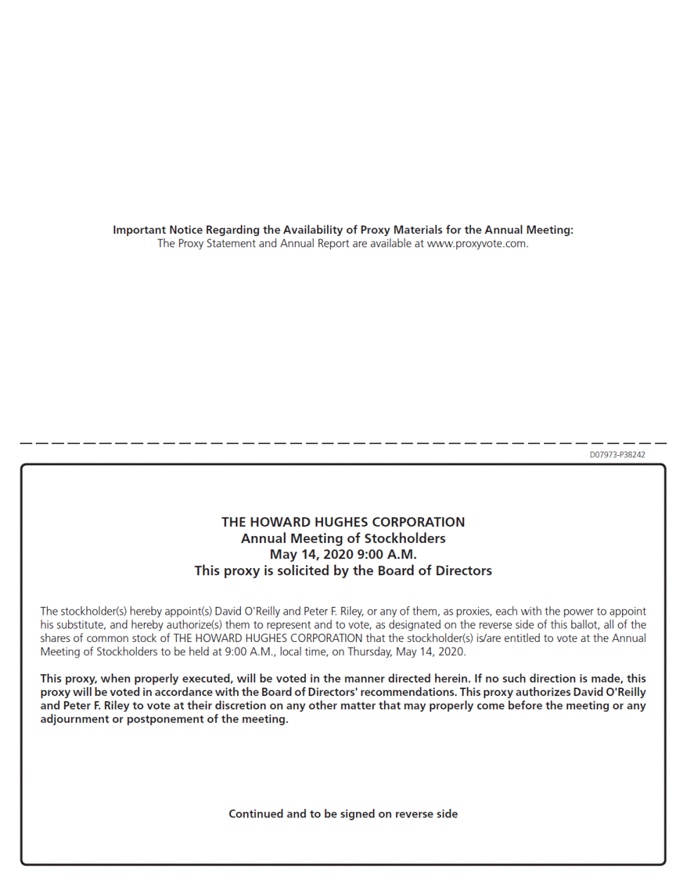 Important Notice Regarding the Availability of Proxy Materials for the Annual Meeting: The Proxy Statement and Annual Report are available at www.proxyvote.com. D07973-P38242 THE HOWARD HUGHES CORPORATION Annual Meeting of Stockholders May 14, 2020 9:00 A.M. This proxy is solicited by the Board of Directors The stockholder(s) hereby appoint(s) David O'Reilly and Peter F. Riley, or any of them, as proxies, each with the power to appoint his substitute, and hereby authorize(s) them to represent and to vote, as designated on the reverse side of this ballot, all of the shares of common stock of THE HOWARD HUGHES CORPORATION that the stockholder(s) is/are entitled to vote at the Annual Meeting of Stockholders to be held at 9:00 A.M., local time, on Thursday, May 14, 2020. This proxy, when properly executed, will be voted in the manner directed herein. If no such direction is made, this proxy will be voted in accordance with the Board of Directors' recommendations. This proxy authorizes David O'Reilly and Peter F. Riley to vote at their discretion on any other matter that may properly come before the meeting or any adjournment or postponement of the meeting. Continued and to be signed on reverse side