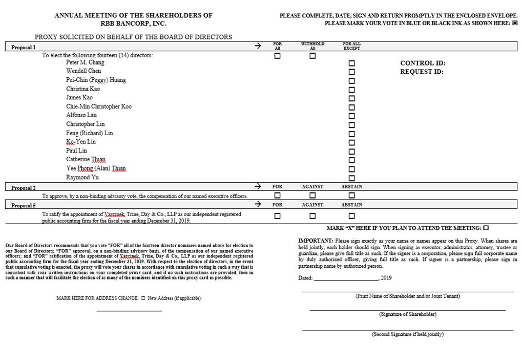 ANNUAL MEETING OF THE SHAREHOLDERS OF RBB BANCORP, INC. PLEASE COMPLETE, DATE, SIGN AND RETURN PROMPTLY IN THE ENCLOSED ENVELOPE. PLEASE MARK YOUR VOTE IN BLUE OR BLACK INK AS SHOWN HERE: PROXY SOLICITED ON BEHALF OF THE BOARD OF DIRECTORS Proposal 1 FOR All WITHHOLD All FOR ALL EXCEPT To elect the following twelve (14) directors: Wendell Chen CONTROL ID: James Kao REQUEST ID: Chie-Min Christopher Koo Christopher Lin Paul Lin Yee Phong (Alan) Thian Peter M. Chang Pei-Chin (Peggy) Huang Christina Kao Ko-Yen Lin Feng (Richard) Lin Alfonso Lau Catherine Thian Raymond Yu Proposal 2 FOR AGAINST ABSTAIN To approve, by a non-binding advisory vote, the compensation of our named executive officers. Proposal 5 FOR AGAINST ABSTAIN To ratify the appointment of Vavrinek, Trine, Day & Co., LLP as our independent registered public accounting firm for the fiscal year ending December 31, 2019. MARK “X” HERE IF YOU PLAN TO ATTEND THE MEETING: Our Board of Directors recommends that you vote “FOR” all of the fourteen director nominees named above for election to our Board of Directors; “FOR” approval, on a non-binding advisory basis, of the compensation of our named executive officers; and “FOR” ratification of the appointment of Vavrinek, Trine, Day & Co., LLP as our independent registered public accounting firm for the fiscal year ending December 31, 2019. MARK HERE FOR ADDRESS CHANGE New Address (if applicable): IMPORTANT: Please sign exactly as your name or names appear on this Proxy. When shares are held jointly, each holder should sign. When signing as executor, administrator, attorney, trustee or guardian, please give full title as such. If the signer is a corporation, please sign full corporate name by duly authorized officer, giving full title as such. If signer is a partnership, please sign in partnership name by authorized person. Dated:, 2019 (Print Name of Shareholder and/or Joint Tenant) (Signature of Shareholder) (Second Signature if held jointly)