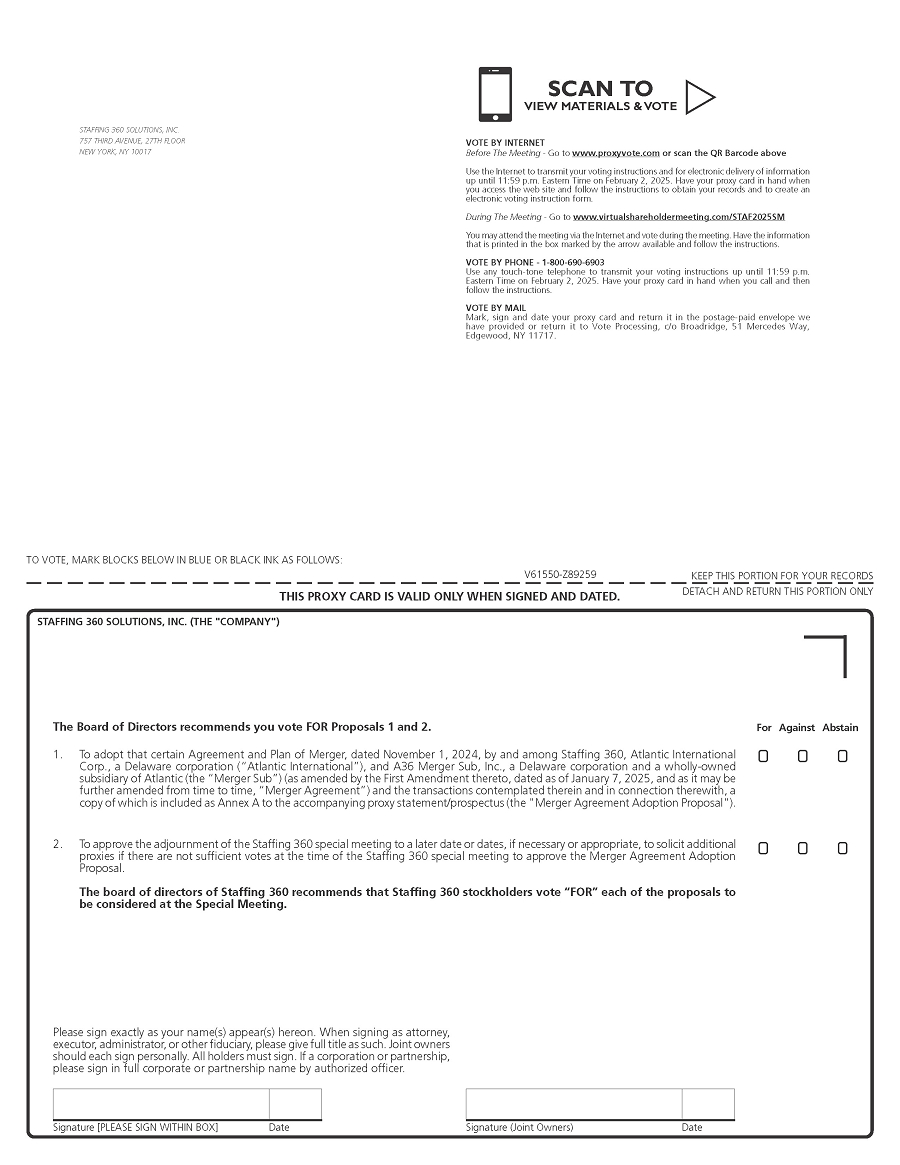 This document, which forms part of a registration statement on Form S-4 filed with the SEC by Atlantic International, constitutes a prospectus of Atlantic International under Section 5 of the Securities Act of 1933, as amended (the “Securities Act”), with respect to the shares of common stock of Atlantic International to be issued to Staffing 360 Solutions equity holders pursuant to the Agreement and Plan of Merger, dated as of November 1, 2024, by and among Atlantic International Corp., a Delaware corporation (“Atlantic International”), Staffing 360 Solutions, Inc., a Delaware corporation (“Staffing 360”), and A36 Merger Sub, Inc., a Delaware corporation and a wholly-owned subsidiary of Atlantic (the “Merger Sub”) (as amended by the First Amendment thereto, dated as of January 7, 2025, and as it may be further amended from time to time, the “Merger Agreement”). This document also constitutes a proxy statement of Staffing 360 under Section 14(a) of the Securities Exchange Act of 1934, as amended (the “Exchange Act”). It also constitutes a Notice of the Special Meeting of Stockholders of Staffing 360.