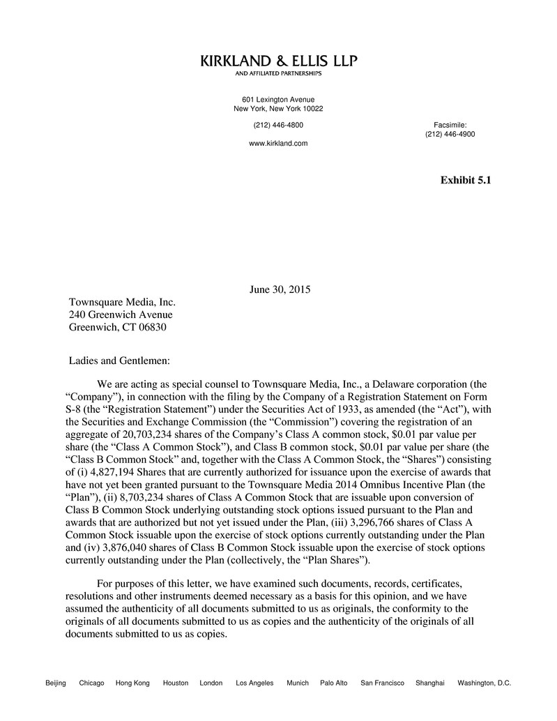 601 Lexington Avenue   New York, New York 10022   (212) 446-4800   www.kirkland.com   Facsimile:   (212) 446-4900      Beijing       Chicago      Hong Kong       Houston      London       Los Angeles       Munich      Palo Alto       San Francisco      Shanghai       Washington, D.C.      Exhibit 5.1                      June 30, 2015   Townsquare Media, Inc.   240 Greenwich Avenue   Greenwich, CT 06830           Ladies and Gentlemen:   We are acting as special counsel to Townsquare Media, Inc., a Delaware corporation (the   “Company”), in connection with the filing by the Company of a Registration Statement on Form   S-8 (the “Registration Statement”) under the Securities Act of 1933, as amended (the “Act”), with   the Securities and Exchange Commission (the “Commission”) covering the registration of an   aggregate of 20,703,234 shares of the Company’s Class A common stock, $0.01 par value per   share (the “Class A Common Stock”), and Class B common stock, $0.01 par value per share (the   “Class B Common Stock” and, together with the Class A Common Stock, the “Shares”) consisting   of (i) 4,827,194 Shares that are currently authorized for issuance upon the exercise of awards that   have not yet been granted pursuant to the Townsquare Media 2014 Omnibus Incentive Plan (the   “Plan”), (ii) 8,703,234 shares of Class A Common Stock that are issuable upon conversion of   Class B Common Stock underlying outstanding stock options issued pursuant to the Plan and   awards that are authorized but not yet issued under the Plan, (iii) 3,296,766 shares of Class A   Common Stock issuable upon the exercise of stock options currently outstanding under the Plan   and (iv) 3,876,040 shares of Class B Common Stock issuable upon the exercise of stock options   currently outstanding under the Plan (collectively, the “Plan Shares”).   For purposes of this letter, we have examined such documents, records, certificates,   resolutions and other instruments deemed necessary as a basis for this opinion, and we have   assumed the authenticity of all documents submitted to us as originals, the conformity to the   originals of all documents submitted to us as copies and the authenticity of the originals of all   documents submitted to us as copies.