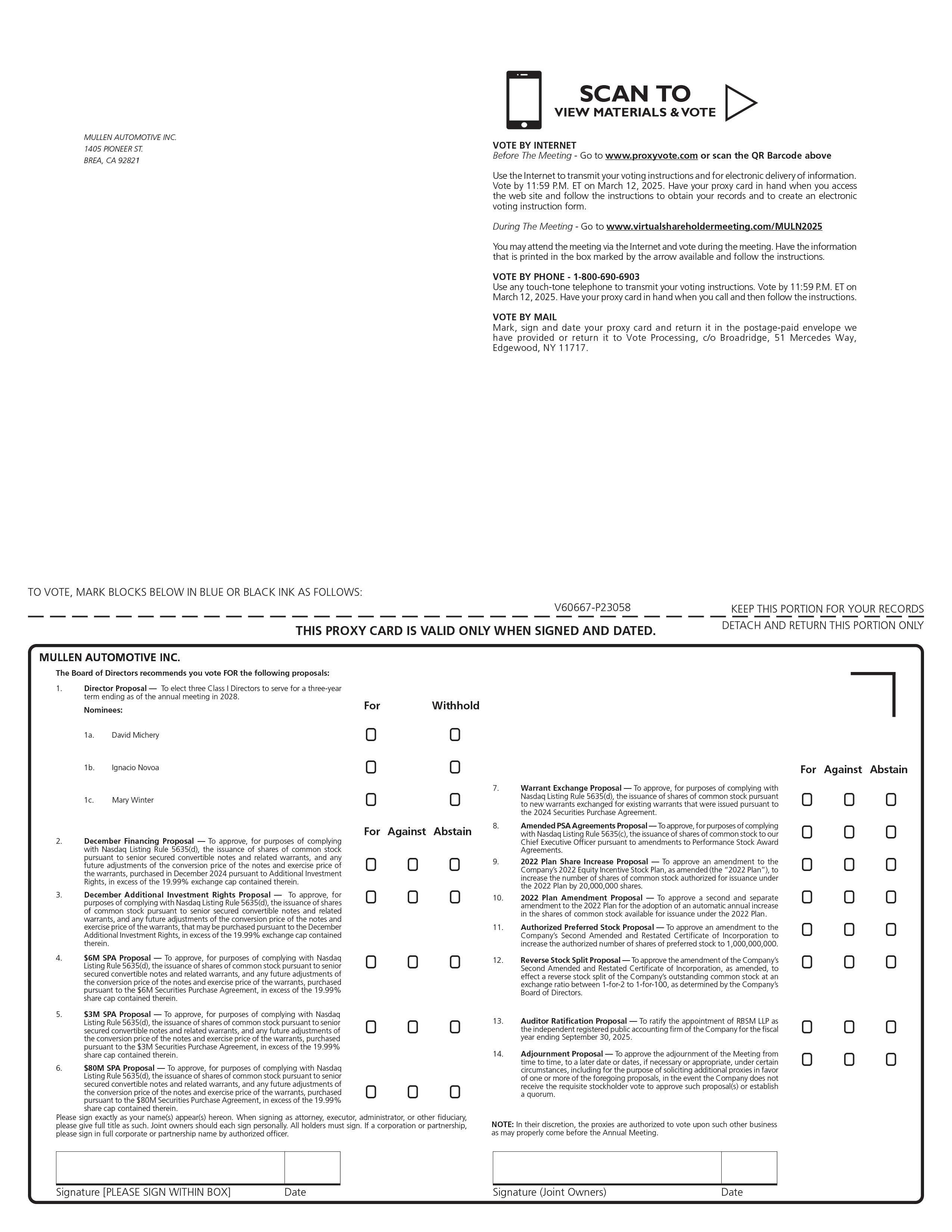 Signature [PLEASE SIGN WITHIN BOX] Date Signature (Joint Owners) Date TO VOTE, MARK BLOCKS BELOW IN BLUE OR BLACK INK AS FOLLOWS: KEEP THIS PORTION FOR YOUR RECORDS THIS PROXY CARD IS VALID ONLY WHEN SIGNED AND DATED. DETACH AND RETURN THIS PORTION ONLY V60667-P23058 Nominees: 2. December Financing Proposal — To approve, for purposes of complying with Nasdaq Listing Rule 5635(d), the issuance of shares of common stock pursuant to senior secured convertible notes and related warrants, and any future adjustments of the conversion price of the notes and exercise price of the warrants, purchased in December 2024 pursuant to Additional Investment Rights, in excess of the 19.99% exchange cap contained therein. 3. December Additional Investment Rights Proposal — To approve, for purposes of complying with Nasdaq Listing Rule 5635(d), the issuance of shares of common stock pursuant to senior secured convertible notes and related warrants, and any future adjustments of the conversion price of the notes and exercise price of the warrants, that may be purchased pursuant to the December Additional Investment Rights, in excess of the 19.99% exchange cap contained therein. 4. $6M SPA Proposal — To approve, for purposes of complying with Nasdaq Listing Rule 5635(d), the issuance of shares of common stock pursuant to senior secured convertible notes and related warrants, and any future adjustments of the conversion price of the notes and exercise price of the warrants, purchased pursuant to the $6M Securities Purchase Agreement, in excess of the 19.99% share cap contained therein. 6. $80M SPA Proposal — To approve, for purposes of complying with Nasdaq Listing Rule 5635(d), the issuance of shares of common stock pursuant to senior secured convertible notes and related warrants, and any future adjustments of the conversion price of the notes and exercise price of the warrants, purchased pursuant to the $80M Securities Purchase Agreement, in excess of the 19.99% share cap contained therein. 7. Warrant Exchange Proposal — To approve, for purposes of complying with Nasdaq Listing Rule 5635(d), the issuance of shares of common stock pursuant to new warrants exchanged for existing warrants that were issued pursuant to the 2024 Securities Purchase Agreement. 8. Amended PSA Agreements Proposal — To approve, for purposes of complying with Nasdaq Listing Rule 5635(c), the issuance of shares of common stock to our Chief Executive Officer pursuant to amendments to Performance Stock Award Agreements. 9. 2022 Plan Share Increase Proposal — To approve an amendment to the Company’s 2022 Equity Incentive Stock Plan, as amended (the “2022 Plan”), to increase the number of shares of common stock authorized for issuance under the 2022 Plan by 20,000,000 shares. 10. 2022 Plan Amendment Proposal — To approve a second and separate amendment to the 2022 Plan for the adoption of an automatic annual increase in the shares of common stock available for issuance under the 2022 Plan. 11. Authorized Preferred Stock Proposal — To approve an amendment to the Company’s Second Amended and Restated Certificate of Incorporation to increase the authorized number of shares of preferred stock to 1,000,000,000. 12. Reverse Stock Split Proposal — To approve the amendment of the Company’s Second Amended and Restated Certificate of Incorporation, as amended, to effect a reverse stock split of the Company’s outstanding common stock at an exchange ratio between 1-for-2 to 1-for-100, as determined by the Company’s Board of Directors. 13. Auditor Ratification Proposal — To ratify the appointment of RBSM LLP as the independent registered public accounting firm of the Company for the fiscal year ending September 30, 2025. 14. Adjournment Proposal — To approve the adjournment of the Meeting from time to time, to a later date or dates, if necessary or appropriate, under certain circumstances, including for the purpose of soliciting additional proxies in favor of one or more of the foregoing proposals, in the event the Company does not receive the requisite stockholder vote to approve such proposal(s) or establish a quorum. 1. Director Proposal — To elect three Class I Directors to serve for a three-year term ending as of the annual meeting in 2028. 1a. David Michery 1b. Ignacio Novoa 1c. Mary Winter For Against Abstain For Withhold ! ! The Board of Directors recommends you vote FOR the following proposals: Please sign exactly as your name(s) appear(s) hereon. When signing as attorney, executor, administrator, or other fiduciary, please give full title as such. Joint owners should each sign personally. All holders must sign. If a corporation or partnership, please sign in full corporate or partnership name by authorized officer. NOTE: In their discretion, the proxies are authorized to vote upon such other business as may properly come before the Annual Meeting. MULLEN AUTOMOTIVE INC. 1405 PIONEER ST. BREA, CA 92821 MULLEN AUTOMOTIVE INC. ! ! 5. $3M SPA Proposal — To approve, for purposes of complying with Nasdaq Listing Rule 5635(d), the issuance of shares of common stock pursuant to senior secured convertible notes and related warrants, and any future adjustments of the conversion price of the notes and exercise price of the warrants, purchased pursuant to the $3M Securities Purchase Agreement, in excess of the 19.99% share cap contained therein. ! ! ! ! ! ! ! ! ! ! ! ! ! ! ! ! ! For Against Abstain ! ! ! ! ! ! ! ! ! ! ! ! ! ! ! ! ! ! ! ! ! ! ! ! SCAN TO VIEW MATERIALS & VOTE w VOTE BY INTERNET Before The Meeting - Go to www.proxyvote.com or scan the QR Barcode above Use the Internet to transmit your voting instructions and for electronic delivery of information. Vote by 11:59 P.M. ET on March 12, 2025. Have your proxy card in hand when you access the web site and follow the instructions to obtain your records and to create an electronic voting instruction form. During The Meeting - Go to www.virtualshareholderme