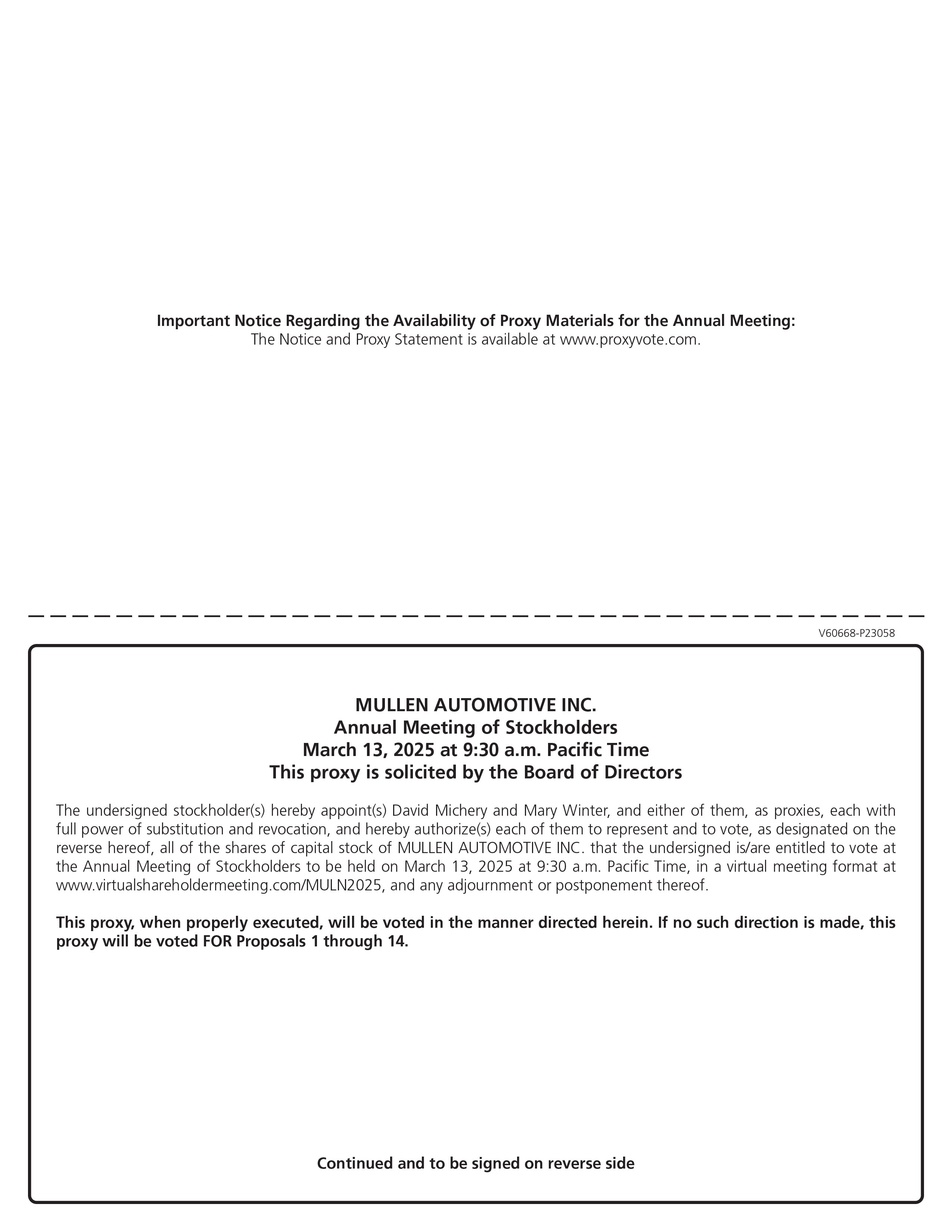 V60668-P23058 MULLEN AUTOMOTIVE INC. Annual Meeting of Stockholders March 13, 2025 at 9:30 a.m. Pacific Time This proxy is solicited by the Board of Directors The undersigned stockholder(s) hereby appoint(s) David Michery and Mary Winter, and either of them, as proxies, each with full power of substitution and revocation, and hereby authorize(s) each of them to represent and to vote, as designated on the reverse hereof, all of the shares of capital stock of MULLEN AUTOMOTIVE INC. that the undersigned is/are entitled to vote at the Annual Meeting of Stockholders to be held on March 13, 2025 at 9:30 a.m. Pacific Time, in a virtual meeting format at www.virtualshareholdermeeting.com/MULN2025, and any adjournment or postponement thereof. This proxy, when properly executed, will be voted in the manner directed herein. If no such direction is made, this proxy will be voted FOR Proposals 1 through 14. Continued and to be signed on reverse side Important Notice Regarding the Availability of Proxy Materials for the Annual Meeting: The Notice and Proxy Statement is available at www.proxyvote.com.