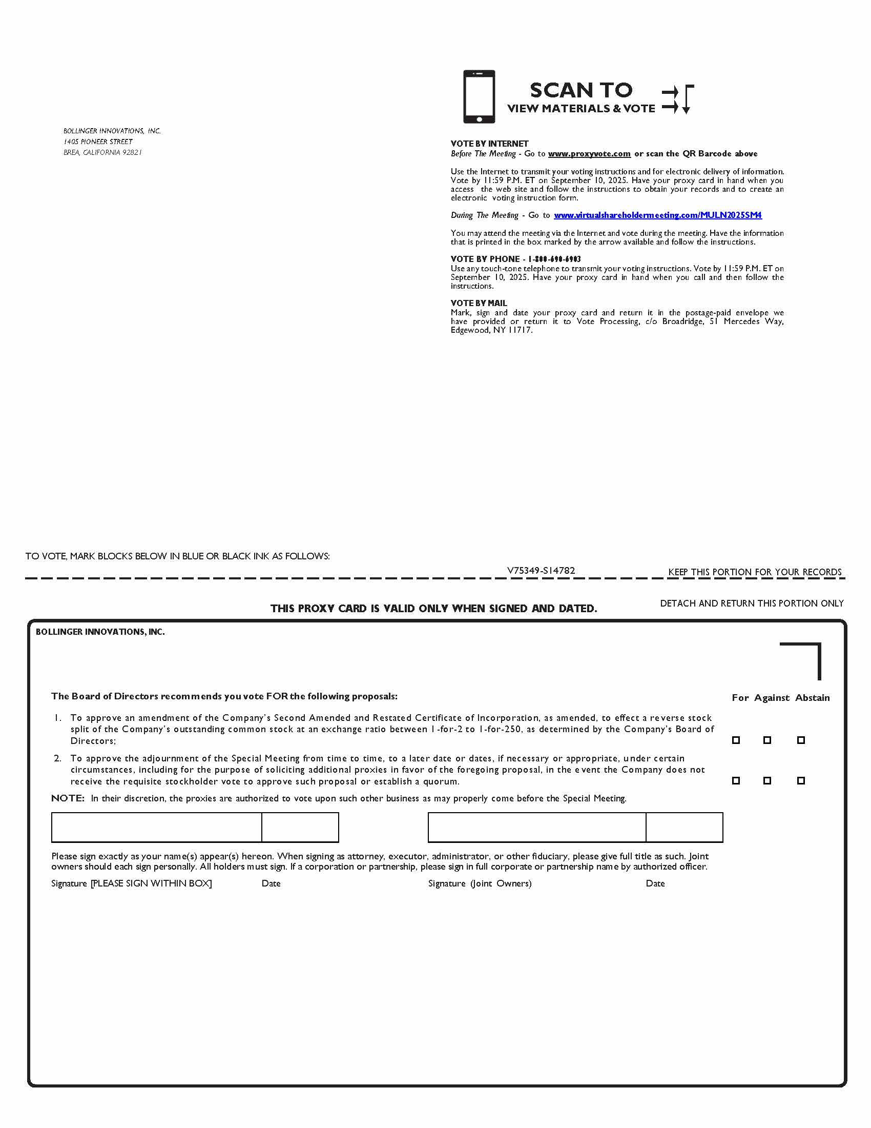 I> SCAN TO VIEW MATERIALS & VOTE BOLLINGER INNOVATIONS, INC. 1405 PIONEER STREET BREA, CALIFORNIA 92821 VOTE BY INTERNET Before The Meeting - Go to www.proxyvote.com or scan the QR Barcode above Use the Internet to transmit your voting instructions and for electronic delivery of information. Vote by 11:59 P.M. ET on September 10, 2025. Have your proxy card in hand when you access the web site and follow the instructions to obtain your records and to create an electronic voting instruction form. During The Meeting - Go to www.virtualshareholdermeeting.com/MULN2025SM4 You may attend the meeting via the Internet and vote during the meeting. Have the information that is printed in the box marked by the arrow available and follow the instructions. VOTE BY PHONE - 1-800-690-6903 Use any touch-tone telephone to transmit your voting instructions. Vote by 11:59 P.M. ET on September 10, 2025. Have your proxy card in hand when you call and then follow the instructions. VOTE BY MAIL Mark, sign and date your proxy card and return it in the postage-paid envelope we have provided or return it to Vote Processing, c/o Broadridge, 51 Mercedes Way, Edgewood, NY 11717. TO VOTE, MARK BLOCKS BELOW IN BLUE OR BLACK INK AS FOLLOWS: V75349-S14782 KEEP THIS PORTION FOR YOUR RECORDS BOLLINGER INNOVATIONS, INC. THIS PROXY CARD IS VALID ONLY WHEN SIGNED AND DATED. DETACH AND RETURN THIS PORTION ONLY The Board of Directors recommends you vote FOR the following proposals: For Against Abstain 1. To approve an amendment of the Company’s Second Amended and Restated Certificate of Incorporation, as amended, to effect a reverse stock split of the Company’s outstanding common stock at an exchange ratio between 1-for-2 to 1-for-250, as determined by the Company’s Board of Directors; o o o2. To approve the adjournment of the Special Meeting from time to time, to a later date or dates, if necessary or appropriate, under certain circumstances, including for the purpose of soliciting additional proxies in favor of the foregoing proposal, in the event the Company does not receive the requisite stockholder vote to approve such proposal or establish a quorum. o o oNOTE: In their discretion, the proxies are authorized to vote upon such other business as may properly come before the Special Meeting. Please sign exactly as your name(s) appear(s) hereon. When signing as attorney, executor, administrator, or other fiduciary, please give full title as such. Joint owners should each sign personally. All holders must sign. If a corporation or partnership, please sign in full corporate or partnership name by authorized officer. Signature [PLEASE SIGN WITHIN BOX] Date Signature (Joint Owners) Date