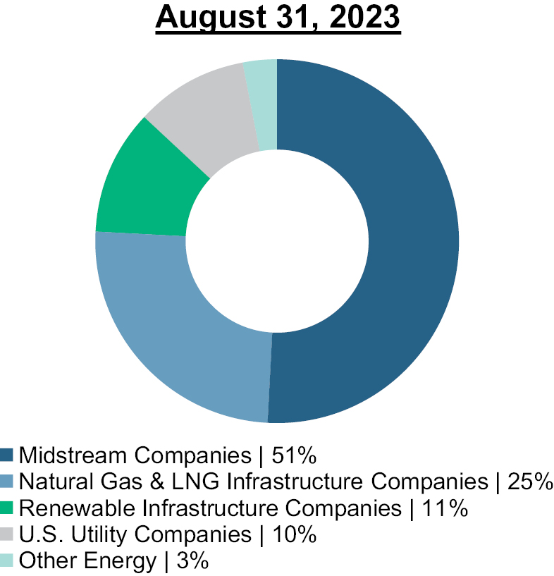 While our near-term outlook for energy infrastructure is nuanced, our intermediate to longer-term outlook is positive for each subsector. In the current environment, we continue to favor companies that are funding capital spending from internally generated cash flow or have minimal external financial needs. We are also favoring companies that have strong balance sheets and manageable exposure to floating interest rates and near-term debt maturities. During fiscal Q3, we continued to increase KMF’s exposure to the midstream sector and decrease the Fund’s exposure to renewable infrastructure and utilities. As of August 31st, midstream investments represented 76% of the Fund’s portfolio (66% of the portfolio at the end of fiscal 2022).