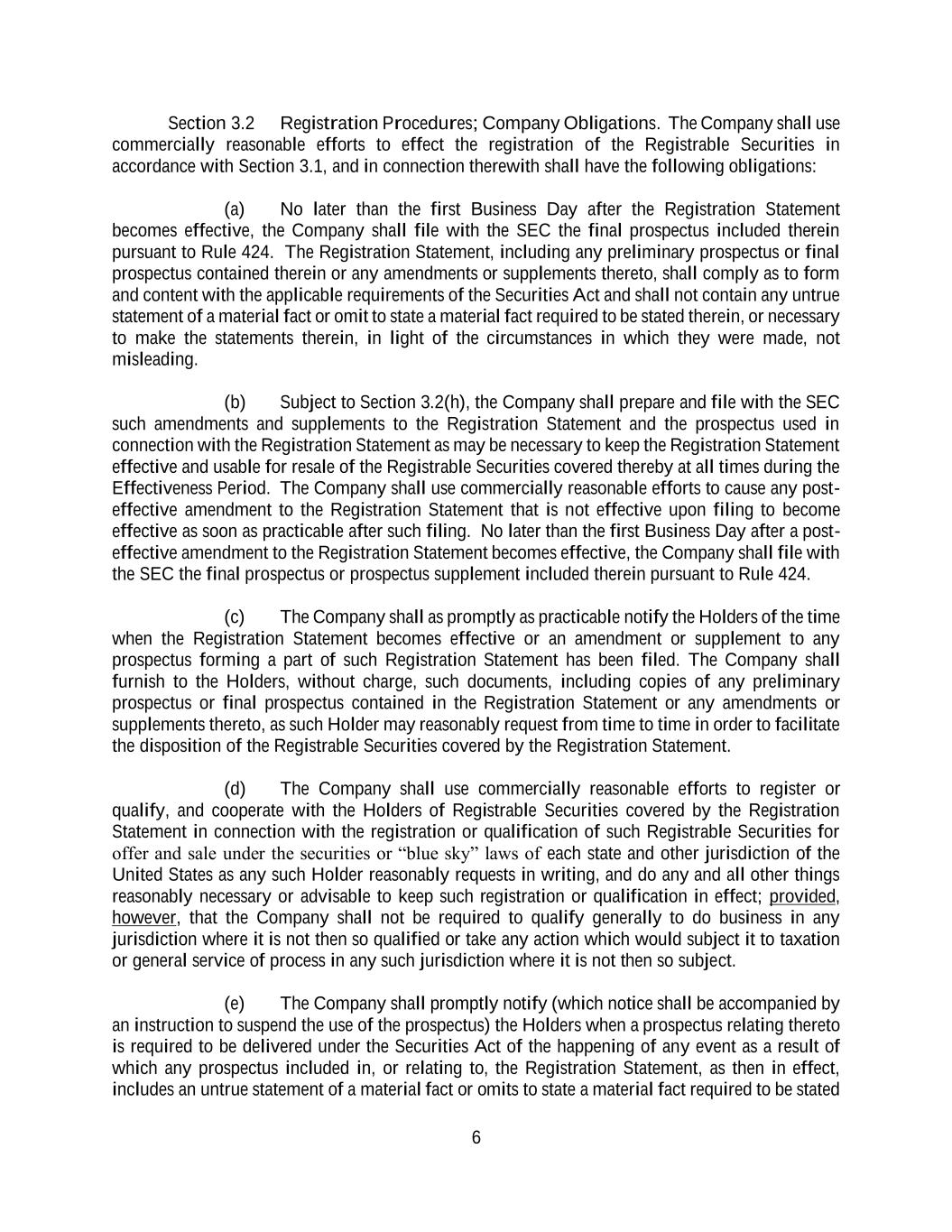 ACTIVE/111903608.1 6 Section 3.2 Registration Procedures; Company Obligations. The Company shall use commercially reasonable efforts to effect the registration of the Registrable Securities in accordance with Section 3.1, and in connection therewith shall have the following obligations: (a) No later than the first Business Day after the Registration Statement becomes effective, the Company shall file with the SEC the final prospectus included therein pursuant to Rule 424. The Registration Statement, including any preliminary prospectus or final prospectus contained therein or any amendments or supplements thereto, shall comply as to form and content with the applicable requirements of the Securities Act and shall not contain any untrue statement of a material fact or omit to state a material fact required to be stated therein, or necessary to make the statements therein, in light of the circumstances in which they were made, not misleading. (b) Subject to Section 3.2(h), the Company shall prepare and file with the SEC such amendments and supplements to the Registration Statement and the prospectus used in connection with the Registration Statement as may be necessary to keep the Registration Statement effective and usable for resale of the Registrable Securities covered thereby at all times during the Effectiveness Period. The Company shall use commercially reasonable efforts to cause any post- effective amendment to the Registration Statement that is not effective upon filing to become effective as soon as practicable after such filing. No later than the first Business Day after a post- effective amendment to the Registration Statement becomes effective, the Company shall file with the SEC the final prospectus or prospectus supplement included therein pursuant to Rule 424. (c) The Company shall as promptly as practicable notify the Holders of the time when the Registration Statement becomes effective or an amendment or supplement to any prospectus forming a part of such Registration Statement has been filed. The Company shall furnish to the Holders, without charge, such documents, including copies of any preliminary prospectus or final prospectus contained in the Registration Statement or any amendments or supplements thereto, as such Holder may reasonably request from time to time in order to facilitate the disposition of the Registrable Securities covered by the Registration Statement. (d) The Company shall use commercially reasonable efforts to register or qualify, and cooperate with the Holders of Registrable Securities covered by the Registration Statement in connection with the registration or qualification of such Registrable Securities for offer and sale under the securities or “blue sky” laws of each state and other jurisdiction of the United States as any such Holder reasonably requests in writing, and do any and all other things reasonably necessary or advisable to keep such registration or qualification in effect; provided, however, that the Company shall not be required to qualify generally to do business in any jurisdiction where it is not then so qualified or take any action which would subject it to taxation or general service of process in any such jurisdiction where it is not then so subject. (e) The Company shall promptly notify (which notice shall be accompanied by an instruction to suspend the use of the prospectus) the Holders when a prospectus relating thereto is required to be delivered under the Securities Act of the happening of any event as a result of which any prospectus included in, or relating to, the Registration Statement, as then in effect, includes an untrue statement of a material fact or omits to state a material fact required to be stated
