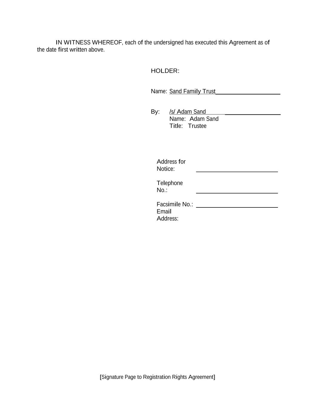[Signature Page to Registration Rights Agreement] IN WITNESS WHEREOF, each of the undersigned has executed this Agreement as of the date first written above. HOLDER: Name: Sand Family Trust_____________________ By: /s/ Adam Sand __________________ Name: Adam Sand Title: Trustee Address for Notice: Telephone No.: Facsimile No.: Email Address: