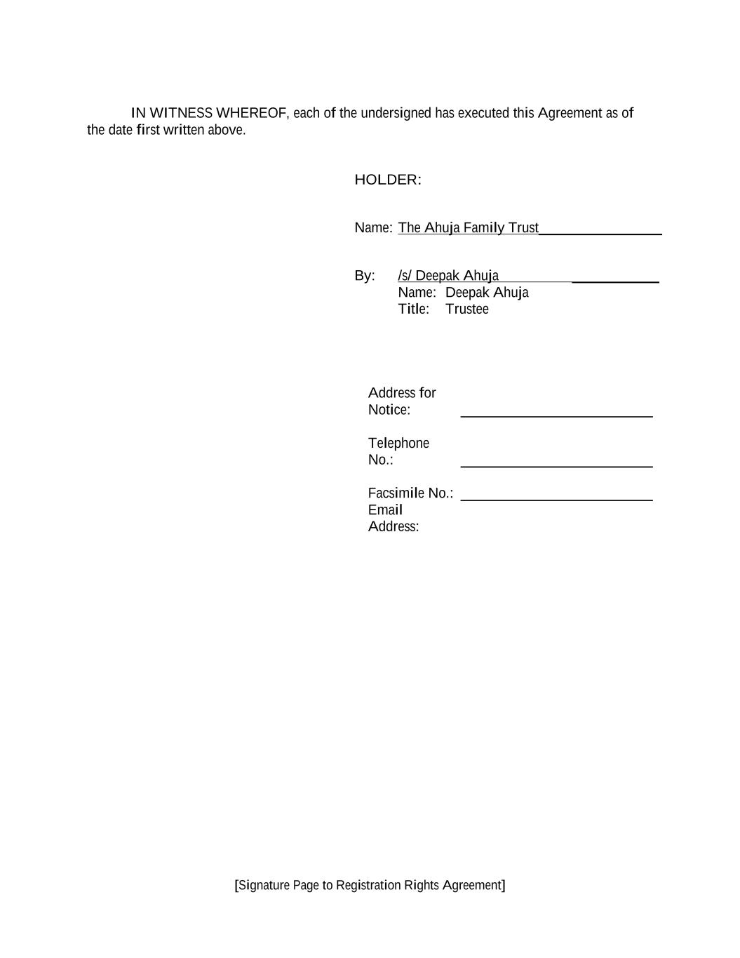 [Signature Page to Registration Rights Agreement] IN WITNESS WHEREOF, each of the undersigned has executed this Agreement as of the date first written above. HOLDER: Name: The Ahuja Family Trust_________________ By: /s/ Deepak Ahuja ____________ Name: Deepak Ahuja Title: Trustee Address for Notice: Telephone No.: Facsimile No.: Email Address: