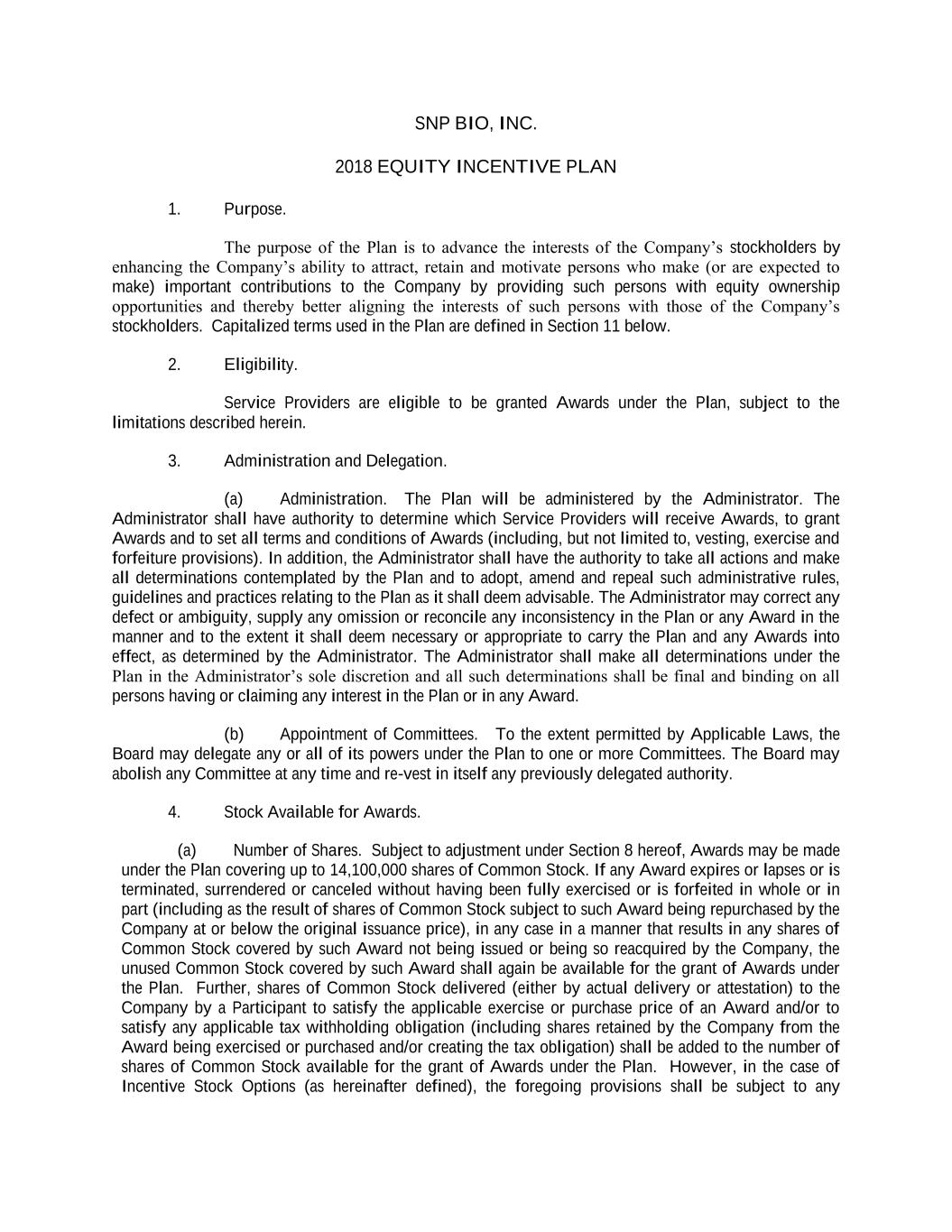 SNP BIO, INC. 2018 EQUITY INCENTIVE PLAN 1. Purpose. The purpose of the Plan is to advance the interests of the Company’s stockholders by enhancing the Company’s ability to attract, retain and motivate persons who make (or are expected to make) important contributions to the Company by providing such persons with equity ownership opportunities and thereby better aligning the interests of such persons with those of the Company’s stockholders. Capitalized terms used in the Plan are defined in Section 11 below. 2. Eligibility. Service Providers are eligible to be granted Awards under the Plan, subject to the limitations described herein. 3. Administration and Delegation. (a) Administration. The Plan will be administered by the Administrator. The Administrator shall have authority to determine which Service Providers will receive Awards, to grant Awards and to set all terms and conditions of Awards (including, but not limited to, vesting, exercise and forfeiture provisions). In addition, the Administrator shall have the authority to take all actions and make all determinations contemplated by the Plan and to adopt, amend and repeal such administrative rules, guidelines and practices relating to the Plan as it shall deem advisable. The Administrator may correct any defect or ambiguity, supply any omission or reconcile any inconsistency in the Plan or any Award in the manner and to the extent it shall deem necessary or appropriate to carry the Plan and any Awards into effect, as determined by the Administrator. The Administrator shall make all determinations under the Plan in the Administrator’s sole discretion and all such determinations shall be final and binding on all persons having or claiming any interest in the Plan or in any Award. (b) Appointment of Committees. To the extent permitted by Applicable Laws, the Board may delegate any or all of its powers under the Plan to one or more Committees. The Board may abolish any Committee at any time and re-vest in itself any previously delegated authority. 4. Stock Available for Awards. (a) Number of Shares. Subject to adjustment under Section 8 hereof, Awards may be made under the Plan covering up to 14,100,000 shares of Common Stock. If any Award expires or lapses or is terminated, surrendered or canceled without having been fully exercised or is forfeited in whole or in part (including as the result of shares of Common Stock subject to such Award being repurchased by the Company at or below the original issuance price), in any case in a manner that results in any shares of Common Stock covered by such Award not being issued or being so reacquired by the Company, the unused Common Stock covered by such Award shall again be available for the grant of Awards under the Plan. Further, shares of Common Stock delivered (either by actual delivery or attestation) to the Company by a Participant to satisfy the applicable exercise or purchase price of an Award and/or to satisfy any applicable tax withholding obligation (including shares retained by the Company from the Award being exercised or purchased and/or creating the tax obligation) shall be added to the number of shares of Common Stock available for the grant of Awards under the Plan. However, in the case of Incentive Stock Options (as hereinafter defined), the foregoing provisions shall be subject to any