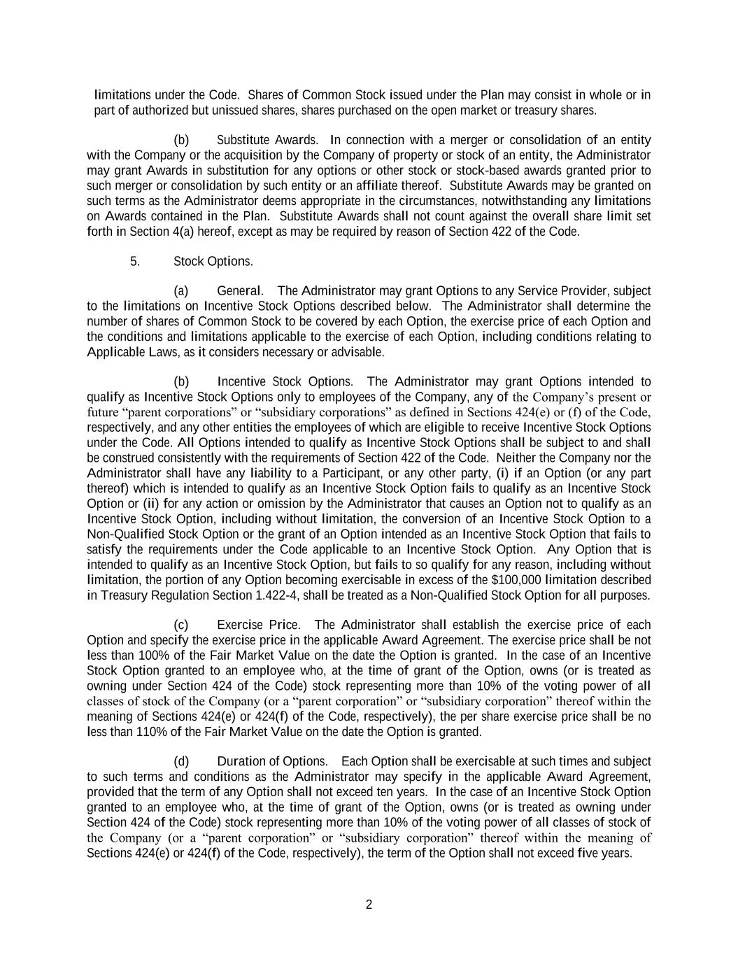 2 limitations under the Code. Shares of Common Stock issued under the Plan may consist in whole or in part of authorized but unissued shares, shares purchased on the open market or treasury shares. (b) Substitute Awards. In connection with a merger or consolidation of an entity with the Company or the acquisition by the Company of property or stock of an entity, the Administrator may grant Awards in substitution for any options or other stock or stock-based awards granted prior to such merger or consolidation by such entity or an affiliate thereof. Substitute Awards may be granted on such terms as the Administrator deems appropriate in the circumstances, notwithstanding any limitations on Awards contained in the Plan. Substitute Awards shall not count against the overall share limit set forth in Section 4(a) hereof, except as may be required by reason of Section 422 of the Code. 5. Stock Options. (a) General. The Administrator may grant Options to any Service Provider, subject to the limitations on Incentive Stock Options described below. The Administrator shall determine the number of shares of Common Stock to be covered by each Option, the exercise price of each Option and the conditions and limitations applicable to the exercise of each Option, including conditions relating to Applicable Laws, as it considers necessary or advisable. (b) Incentive Stock Options. The Administrator may grant Options intended to qualify as Incentive Stock Options only to employees of the Company, any of the Company’s present or future “parent corporations” or “subsidiary corporations” as defined in Sections 424(e) or (f) of the Code, respectively, and any other entities the employees of which are eligible to receive Incentive Stock Options under the Code. All Options intended to qualify as Incentive Stock Options shall be subject to and shall be construed consistently with the requirements of Section 422 of the Code. Neither the Company nor the Administrator shall have any liability to a Participant, or any other party, (i) if an Option (or any part thereof) which is intended to qualify as an Incentive Stock Option fails to qualify as an Incentive Stock Option or (ii) for any action or omission by the Administrator that causes an Option not to qualify as an Incentive Stock Option, including without limitation, the conversion of an Incentive Stock Option to a Non-Qualified Stock Option or the grant of an Option intended as an Incentive Stock Option that fails to satisfy the requirements under the Code applicable to an Incentive Stock Option. Any Option that is intended to qualify as an Incentive Stock Option, but fails to so qualify for any reason, including without limitation, the portion of any Option becoming exercisable in excess of the $100,000 limitation described in Treasury Regulation Section 1.422-4, shall be treated as a Non-Qualified Stock Option for all purposes. (c) Exercise Price. The Administrator shall establish the exercise price of each Option and specify the exercise price in the applicable Award Agreement. The exercise price shall be not less than 100% of the Fair Market Value on the date the Option is granted. In the case of an Incentive Stock Option granted to an employee who, at the time of grant of the Option, owns (or is treated as owning under Section 424 of the Code) stock representing more than 10% of the voting power of all classes of stock of the Company (or a “parent corporation” or “subsidiary corporation” thereof within the meaning of Sections 424(e) or 424(f) of the Code, respectively), the per share exercise price shall be no less than 110% of the Fair Market Value on the date the Option is granted. (d) Duration of Options. Each Option shall be exercisable at such times and subject to such terms and conditions as the Administrator may specify in the applicable Award Agreement, provided that the term of any Option shall not exceed ten years. In the case of an Incentive Stock Option granted to an employee who, at the time of grant of the Option, owns (or is treated as owning under Section 424 of the Code) stock representing more than 10% of the voting power of all classes of stock of the Company (or a “parent corporation” or “subsidiary corporation” thereof within the meaning of Sections 424(e) or 424(f) of the Code, respectively), the term of the Option shall not exceed five years.