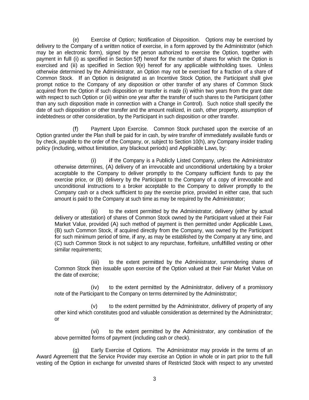3 (e) Exercise of Option; Notification of Disposition. Options may be exercised by delivery to the Company of a written notice of exercise, in a form approved by the Administrator (which may be an electronic form), signed by the person authorized to exercise the Option, together with payment in full (i) as specified in Section 5(f) hereof for the number of shares for which the Option is exercised and (ii) as specified in Section 9(e) hereof for any applicable withholding taxes. Unless otherwise determined by the Administrator, an Option may not be exercised for a fraction of a share of Common Stock. If an Option is designated as an Incentive Stock Option, the Participant shall give prompt notice to the Company of any disposition or other transfer of any shares of Common Stock acquired from the Option if such disposition or transfer is made (i) within two years from the grant date with respect to such Option or (ii) within one year after the transfer of such shares to the Participant (other than any such disposition made in connection with a Change in Control). Such notice shall specify the date of such disposition or other transfer and the amount realized, in cash, other property, assumption of indebtedness or other consideration, by the Participant in such disposition or other transfer. (f) Payment Upon Exercise. Common Stock purchased upon the exercise of an Option granted under the Plan shall be paid for in cash, by wire transfer of immediately available funds or by check, payable to the order of the Company, or, subject to Section 10(h), any Company insider trading policy (including, without limitation, any blackout periods) and Applicable Laws, by: (i) if the Company is a Publicly Listed Company, unless the Administrator otherwise determines, (A) delivery of an irrevocable and unconditional undertaking by a broker acceptable to the Company to deliver promptly to the Company sufficient funds to pay the exercise price, or (B) delivery by the Participant to the Company of a copy of irrevocable and unconditional instructions to a broker acceptable to the Company to deliver promptly to the Company cash or a check sufficient to pay the exercise price, provided in either case, that such amount is paid to the Company at such time as may be required by the Administrator; (ii) to the extent permitted by the Administrator, delivery (either by actual delivery or attestation) of shares of Common Stock owned by the Participant valued at their Fair Market Value, provided (A) such method of payment is then permitted under Applicable Laws, (B) such Common Stock, if acquired directly from the Company, was owned by the Participant for such minimum period of time, if any, as may be established by the Company at any time, and (C) such Common Stock is not subject to any repurchase, forfeiture, unfulfilled vesting or other similar requirements; (iii) to the extent permitted by the Administrator, surrendering shares of Common Stock then issuable upon exercise of the Option valued at their Fair Market Value on the date of exercise; (iv) to the extent permitted by the Administrator, delivery of a promissory note of the Participant to the Company on terms determined by the Administrator; (v) to the extent permitted by the Administrator, delivery of property of any other kind which constitutes good and valuable consideration as determined by the Administrator; or (vi) to the extent permitted by the Administrator, any combination of the above permitted forms of payment (including cash or check). (g) Early Exercise of Options. The Administrator may provide in the terms of an Award Agreement that the Service Provider may exercise an Option in whole or in part prior to the full vesting of the Option in exchange for unvested shares of Restricted Stock with respect to any unvested