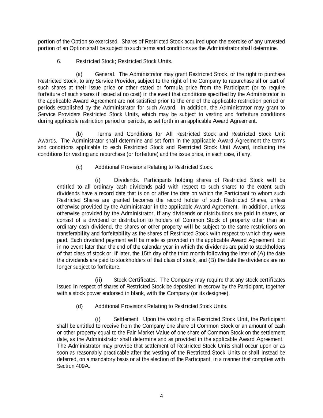 4 portion of the Option so exercised. Shares of Restricted Stock acquired upon the exercise of any unvested portion of an Option shall be subject to such terms and conditions as the Administrator shall determine. 6. Restricted Stock; Restricted Stock Units. (a) General. The Administrator may grant Restricted Stock, or the right to purchase Restricted Stock, to any Service Provider, subject to the right of the Company to repurchase all or part of such shares at their issue price or other stated or formula price from the Participant (or to require forfeiture of such shares if issued at no cost) in the event that conditions specified by the Administrator in the applicable Award Agreement are not satisfied prior to the end of the applicable restriction period or periods established by the Administrator for such Award. In addition, the Administrator may grant to Service Providers Restricted Stock Units, which may be subject to vesting and forfeiture conditions during applicable restriction period or periods, as set forth in an applicable Award Agreement. (b) Terms and Conditions for All Restricted Stock and Restricted Stock Unit Awards. The Administrator shall determine and set forth in the applicable Award Agreement the terms and conditions applicable to each Restricted Stock and Restricted Stock Unit Award, including the conditions for vesting and repurchase (or forfeiture) and the issue price, in each case, if any. (c) Additional Provisions Relating to Restricted Stock. (i) Dividends. Participants holding shares of Restricted Stock will be entitled to all ordinary cash dividends paid with respect to such shares to the extent such dividends have a record date that is on or after the date on which the Participant to whom such Restricted Shares are granted becomes the record holder of such Restricted Shares, unless otherwise provided by the Administrator in the applicable Award Agreement. In addition, unless otherwise provided by the Administrator, if any dividends or distributions are paid in shares, or consist of a dividend or distribution to holders of Common Stock of property other than an ordinary cash dividend, the shares or other property will be subject to the same restrictions on transferability and forfeitability as the shares of Restricted Stock with respect to which they were paid. Each dividend payment will be made as provided in the applicable Award Agreement, but in no event later than the end of the calendar year in which the dividends are paid to stockholders of that class of stock or, if later, the 15th day of the third month following the later of (A) the date the dividends are paid to stockholders of that class of stock, and (B) the date the dividends are no longer subject to forfeiture. (ii) Stock Certificates. The Company may require that any stock certificates issued in respect of shares of Restricted Stock be deposited in escrow by the Participant, together with a stock power endorsed in blank, with the Company (or its designee). (d) Additional Provisions Relating to Restricted Stock Units. (i) Settlement. Upon the vesting of a Restricted Stock Unit, the Participant shall be entitled to receive from the Company one share of Common Stock or an amount of cash or other property equal to the Fair Market Value of one share of Common Stock on the settlement date, as the Administrator shall determine and as provided in the applicable Award Agreement. The Administrator may provide that settlement of Restricted Stock Units shall occur upon or as soon as reasonably practicable after the vesting of the Restricted Stock Units or shall instead be deferred, on a mandatory basis or at the election of the Participant, in a manner that complies with Section 409A.