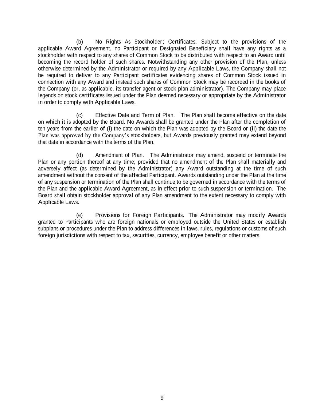 9 (b) No Rights As Stockholder; Certificates. Subject to the provisions of the applicable Award Agreement, no Participant or Designated Beneficiary shall have any rights as a stockholder with respect to any shares of Common Stock to be distributed with respect to an Award until becoming the record holder of such shares. Notwithstanding any other provision of the Plan, unless otherwise determined by the Administrator or required by any Applicable Laws, the Company shall not be required to deliver to any Participant certificates evidencing shares of Common Stock issued in connection with any Award and instead such shares of Common Stock may be recorded in the books of the Company (or, as applicable, its transfer agent or stock plan administrator). The Company may place legends on stock certificates issued under the Plan deemed necessary or appropriate by the Administrator in order to comply with Applicable Laws. (c) Effective Date and Term of Plan. The Plan shall become effective on the date on which it is adopted by the Board. No Awards shall be granted under the Plan after the completion of ten years from the earlier of (i) the date on which the Plan was adopted by the Board or (ii) the date the Plan was approved by the Company’s stockholders, but Awards previously granted may extend beyond that date in accordance with the terms of the Plan. (d) Amendment of Plan. The Administrator may amend, suspend or terminate the Plan or any portion thereof at any time; provided that no amendment of the Plan shall materially and adversely affect (as determined by the Administrator) any Award outstanding at the time of such amendment without the consent of the affected Participant. Awards outstanding under the Plan at the time of any suspension or termination of the Plan shall continue to be governed in accordance with the terms of the Plan and the applicable Award Agreement, as in effect prior to such suspension or termination. The Board shall obtain stockholder approval of any Plan amendment to the extent necessary to comply with Applicable Laws. (e) Provisions for Foreign Participants. The Administrator may modify Awards granted to Participants who are foreign nationals or employed outside the United States or establish subplans or procedures under the Plan to address differences in laws, rules, regulations or customs of such foreign jurisdictions with respect to tax, securities, currency, employee benefit or other matters.