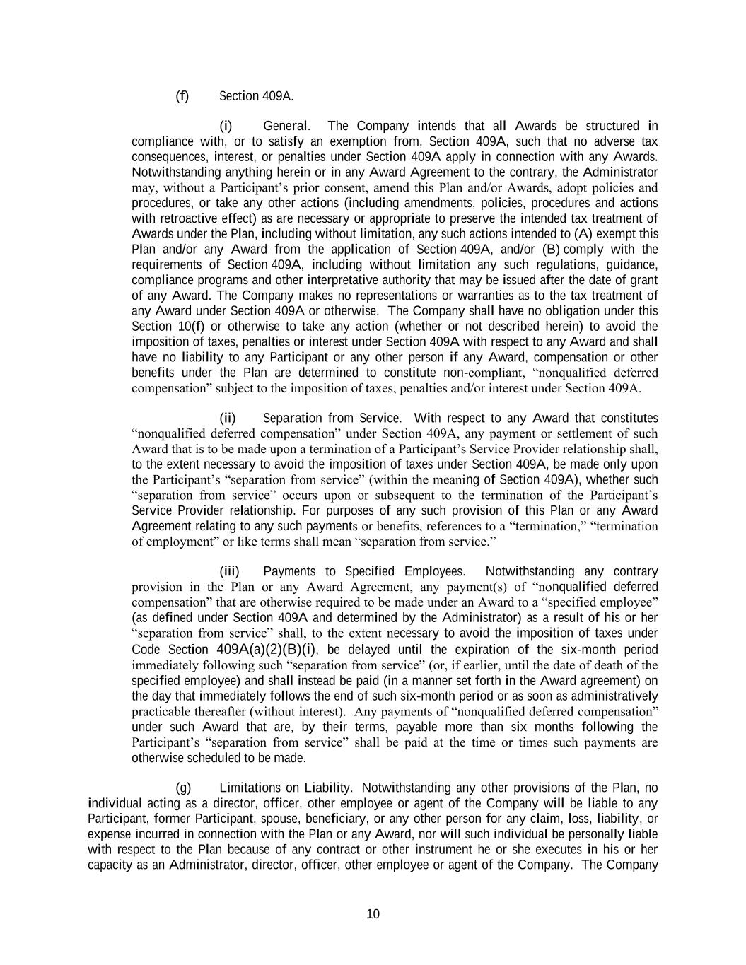 10 (f) Section 409A. (i) General. The Company intends that all Awards be structured in compliance with, or to satisfy an exemption from, Section 409A, such that no adverse tax consequences, interest, or penalties under Section 409A apply in connection with any Awards. Notwithstanding anything herein or in any Award Agreement to the contrary, the Administrator may, without a Participant’s prior consent, amend this Plan and/or Awards, adopt policies and procedures, or take any other actions (including amendments, policies, procedures and actions with retroactive effect) as are necessary or appropriate to preserve the intended tax treatment of Awards under the Plan, including without limitation, any such actions intended to (A) exempt this Plan and/or any Award from the application of Section 409A, and/or (B) comply with the requirements of Section 409A, including without limitation any such regulations, guidance, compliance programs and other interpretative authority that may be issued after the date of grant of any Award. The Company makes no representations or warranties as to the tax treatment of any Award under Section 409A or otherwise. The Company shall have no obligation under this Section 10(f) or otherwise to take any action (whether or not described herein) to avoid the imposition of taxes, penalties or interest under Section 409A with respect to any Award and shall have no liability to any Participant or any other person if any Award, compensation or other benefits under the Plan are determined to constitute non-compliant, “nonqualified deferred compensation” subject to the imposition of taxes, penalties and/or interest under Section 409A. (ii) Separation from Service. With respect to any Award that constitutes “nonqualified deferred compensation” under Section 409A, any payment or settlement of such Award that is to be made upon a termination of a Participant’s Service Provider relationship shall, to the extent necessary to avoid the imposition of taxes under Section 409A, be made only upon the Participant’s “separation from service” (within the meaning of Section 409A), whether such “separation from service” occurs upon or subsequent to the termination of the Participant’s Service Provider relationship. For purposes of any such provision of this Plan or any Award Agreement relating to any such payments or benefits, references to a “termination,” “termination of employment” or like terms shall mean “separation from service.” (iii) Payments to Specified Employees. Notwithstanding any contrary provision in the Plan or any Award Agreement, any payment(s) of “nonqualified deferred compensation” that are otherwise required to be made under an Award to a “specified employee” (as defined under Section 409A and determined by the Administrator) as a result of his or her “separation from service” shall, to the extent necessary to avoid the imposition of taxes under Code Section 409A(a)(2)(B)(i), be delayed until the expiration of the six-month period immediately following such “separation from service” (or, if earlier, until the date of death of the specified employee) and shall instead be paid (in a manner set forth in the Award agreement) on the day that immediately follows the end of such six-month period or as soon as administratively practicable thereafter (without interest). Any payments of “nonqualified deferred compensation” under such Award that are, by their terms, payable more than six months following the Participant’s “separation from service” shall be paid at the time or times such payments are otherwise scheduled to be made. (g) Limitations on Liability. Notwithstanding any other provisions of the Plan, no individual acting as a director, officer, other employee or agent of the Company will be liable to any Participant, former Participant, spouse, beneficiary, or any other person for any claim, loss, liability, or expense incurred in connection with the Plan or any Award, nor will such individual be personally liable with respect to the Plan because of any contract or other instrument he or she executes in his or her capacity as an Administrator, director, officer, other employee or agent of the Company. The Company