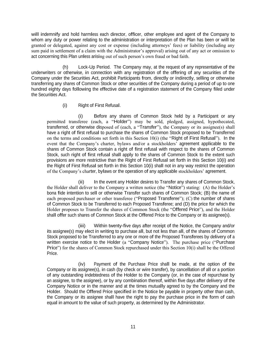 11 will indemnify and hold harmless each director, officer, other employee and agent of the Company to whom any duty or power relating to the administration or interpretation of the Plan has been or will be granted or delegated, against any cost or expense (including attorneys’ fees) or liability (including any sum paid in settlement of a claim with the Administrator’s approval) arising out of any act or omission to act concerning this Plan unless arising out of such person’s own fraud or bad faith. (h) Lock-Up Period. The Company may, at the request of any representative of the underwriters or otherwise, in connection with any registration of the offering of any securities of the Company under the Securities Act, prohibit Participants from, directly or indirectly, selling or otherwise transferring any shares of Common Stock or other securities of the Company during a period of up to one hundred eighty days following the effective date of a registration statement of the Company filed under the Securities Act. (i) Right of First Refusal. (i) Before any shares of Common Stock held by a Participant or any permitted transferee (each, a “Holder”) may be sold, pledged, assigned, hypothecated, transferred, or otherwise disposed of (each, a “Transfer”), the Company or its assignee(s) shall have a right of first refusal to purchase the shares of Common Stock proposed to be Transferred on the terms and conditions set forth in this Section 10(i) (the “Right of First Refusal”). In the event that the Company’s charter, bylaws and/or a stockholders’ agreement applicable to the shares of Common Stock contain a right of first refusal with respect to the shares of Common Stock, such right of first refusal shall apply to the shares of Common Stock to the extent such provisions are more restrictive than the Right of First Refusal set forth in this Section 10(i) and the Right of First Refusal set forth in this Section 10(i) shall not in any way restrict the operation of the Company’s charter, bylaws or the operation of any applicable stockholders’ agreement. (ii) In the event any Holder desires to Transfer any shares of Common Stock, the Holder shall deliver to the Company a written notice (the “Notice”) stating: (A) the Holder’s bona fide intention to sell or otherwise Transfer such shares of Common Stock; (B) the name of each proposed purchaser or other transferee (“Proposed Transferee”); (C) the number of shares of Common Stock to be Transferred to each Proposed Transferee; and (D) the price for which the Holder proposes to Transfer the shares of Common Stock (the “Offered Price”), and the Holder shall offer such shares of Common Stock at the Offered Price to the Company or its assignee(s). (iii) Within twenty-five days after receipt of the Notice, the Company and/or its assignee(s) may elect in writing to purchase all, but not less than all, of the shares of Common Stock proposed to be Transferred to any one or more of the Proposed Transferees by delivery of a written exercise notice to the Holder (a “Company Notice”). The purchase price (“Purchase Price”) for the shares of Common Stock repurchased under this Section 10(i) shall be the Offered Price. (iv) Payment of the Purchase Price shall be made, at the option of the Company or its assignee(s), in cash (by check or wire transfer), by cancellation of all or a portion of any outstanding indebtedness of the Holder to the Company (or, in the case of repurchase by an assignee, to the assignee), or by any combination thereof, within five days after delivery of the Company Notice or in the manner and at the times mutually agreed to by the Company and the Holder. Should the Offered Price specified in the Notice be payable in property other than cash, the Company or its assignee shall have the right to pay the purchase price in the form of cash equal in amount to the value of such property, as determined by the Administrator.