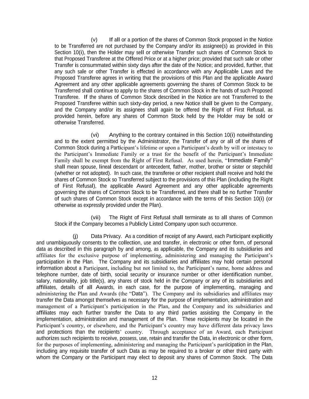 12 (v) If all or a portion of the shares of Common Stock proposed in the Notice to be Transferred are not purchased by the Company and/or its assignee(s) as provided in this Section 10(i), then the Holder may sell or otherwise Transfer such shares of Common Stock to that Proposed Transferee at the Offered Price or at a higher price; provided that such sale or other Transfer is consummated within sixty days after the date of the Notice; and provided, further, that any such sale or other Transfer is effected in accordance with any Applicable Laws and the Proposed Transferee agrees in writing that the provisions of this Plan and the applicable Award Agreement and any other applicable agreements governing the shares of Common Stock to be Transferred shall continue to apply to the shares of Common Stock in the hands of such Proposed Transferee. If the shares of Common Stock described in the Notice are not Transferred to the Proposed Transferee within such sixty-day period, a new Notice shall be given to the Company, and the Company and/or its assignees shall again be offered the Right of First Refusal, as provided herein, before any shares of Common Stock held by the Holder may be sold or otherwise Transferred. (vi) Anything to the contrary contained in this Section 10(i) notwithstanding and to the extent permitted by the Administrator, the Transfer of any or all of the shares of Common Stock during a Participant’s lifetime or upon a Participant’s death by will or intestacy to the Participant’s Immediate Family or a trust for the benefit of the Participant’s Immediate Family shall be exempt from the Right of First Refusal. As used herein, “Immediate Family” shall mean spouse, lineal descendant or antecedent, father, mother, brother or sister or stepchild (whether or not adopted). In such case, the transferee or other recipient shall receive and hold the shares of Common Stock so Transferred subject to the provisions of this Plan (including the Right of First Refusal), the applicable Award Agreement and any other applicable agreements governing the shares of Common Stock to be Transferred, and there shall be no further Transfer of such shares of Common Stock except in accordance with the terms of this Section 10(i) (or otherwise as expressly provided under the Plan). (vii) The Right of First Refusal shall terminate as to all shares of Common Stock if the Company becomes a Publicly Listed Company upon such occurrence. (j) Data Privacy. As a condition of receipt of any Award, each Participant explicitly and unambiguously consents to the collection, use and transfer, in electronic or other form, of personal data as described in this paragraph by and among, as applicable, the Company and its subsidiaries and affiliates for the exclusive purpose of implementing, administering and managing the Participant’s participation in the Plan. The Company and its subsidiaries and affiliates may hold certain personal information about a Participant, including but not limited to, the Participant’s name, home address and telephone number, date of birth, social security or insurance number or other identification number, salary, nationality, job title(s), any shares of stock held in the Company or any of its subsidiaries and affiliates, details of all Awards, in each case, for the purpose of implementing, managing and administering the Plan and Awards (the “Data”). The Company and its subsidiaries and affiliates may transfer the Data amongst themselves as necessary for the purpose of implementation, administration and management of a Participant’s participation in the Plan, and the Company and its subsidiaries and affiliates may each further transfer the Data to any third parties assisting the Company in the implementation, administration and management of the Plan. These recipients may be located in the Participant’s country, or elsewhere, and the Participant’s country may have different data privacy laws and protections than the recipients’ country. Through acceptance of an Award, each Participant authorizes such recipients to receive, possess, use, retain and transfer the Data, in electronic or other form, for the purposes of implementing, administering and managing the Participant’s participation in the Plan, including any requisite transfer of such Data as may be required to a broker or other third party with whom the Company or the Participant may elect to deposit any shares of Common Stock. The Data