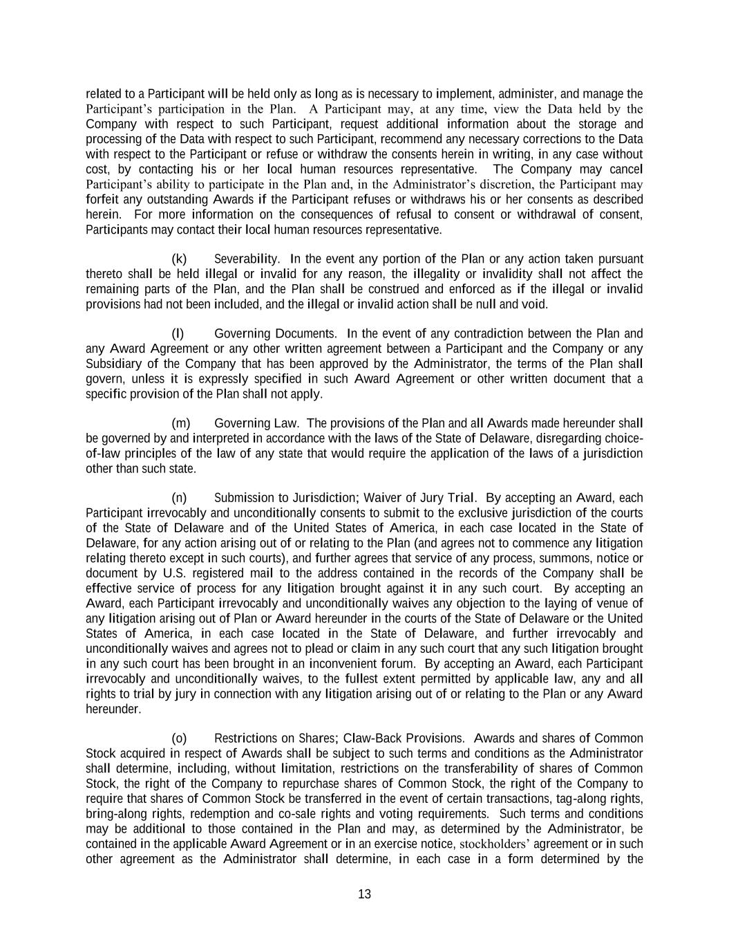 13 related to a Participant will be held only as long as is necessary to implement, administer, and manage the Participant’s participation in the Plan. A Participant may, at any time, view the Data held by the Company with respect to such Participant, request additional information about the storage and processing of the Data with respect to such Participant, recommend any necessary corrections to the Data with respect to the Participant or refuse or withdraw the consents herein in writing, in any case without cost, by contacting his or her local human resources representative. The Company may cancel Participant’s ability to participate in the Plan and, in the Administrator’s discretion, the Participant may forfeit any outstanding Awards if the Participant refuses or withdraws his or her consents as described herein. For more information on the consequences of refusal to consent or withdrawal of consent, Participants may contact their local human resources representative. (k) Severability. In the event any portion of the Plan or any action taken pursuant thereto shall be held illegal or invalid for any reason, the illegality or invalidity shall not affect the remaining parts of the Plan, and the Plan shall be construed and enforced as if the illegal or invalid provisions had not been included, and the illegal or invalid action shall be null and void. (l) Governing Documents. In the event of any contradiction between the Plan and any Award Agreement or any other written agreement between a Participant and the Company or any Subsidiary of the Company that has been approved by the Administrator, the terms of the Plan shall govern, unless it is expressly specified in such Award Agreement or other written document that a specific provision of the Plan shall not apply. (m) Governing Law. The provisions of the Plan and all Awards made hereunder shall be governed by and interpreted in accordance with the laws of the State of Delaware, disregarding choice- of-law principles of the law of any state that would require the application of the laws of a jurisdiction other than such state. (n) Submission to Jurisdiction; Waiver of Jury Trial. By accepting an Award, each Participant irrevocably and unconditionally consents to submit to the exclusive jurisdiction of the courts of the State of Delaware and of the United States of America, in each case located in the State of Delaware, for any action arising out of or relating to the Plan (and agrees not to commence any litigation relating thereto except in such courts), and further agrees that service of any process, summons, notice or document by U.S. registered mail to the address contained in the records of the Company shall be effective service of process for any litigation brought against it in any such court. By accepting an Award, each Participant irrevocably and unconditionally waives any objection to the laying of venue of any litigation arising out of Plan or Award hereunder in the courts of the State of Delaware or the United States of America, in each case located in the State of Delaware, and further irrevocably and unconditionally waives and agrees not to plead or claim in any such court that any such litigation brought in any such court has been brought in an inconvenient forum. By accepting an Award, each Participant irrevocably and unconditionally waives, to the fullest extent permitted by applicable law, any and all rights to trial by jury in connection with any litigation arising out of or relating to the Plan or any Award hereunder. (o) Restrictions on Shares; Claw-Back Provisions. Awards and shares of Common Stock acquired in respect of Awards shall be subject to such terms and conditions as the Administrator shall determine, including, without limitation, restrictions on the transferability of shares of Common Stock, the right of the Company to repurchase shares of Common Stock, the right of the Company to require that shares of Common Stock be transferred in the event of certain transactions, tag-along rights, bring-along rights, redemption and co-sale rights and voting requirements. Such terms and conditions may be additional to those contained in the Plan and may, as determined by the Administrator, be contained in the applicable Award Agreement or in an exercise notice, stockholders’ agreement or in such other agreement as the Administrator shall determine, in each case in a form determined by the