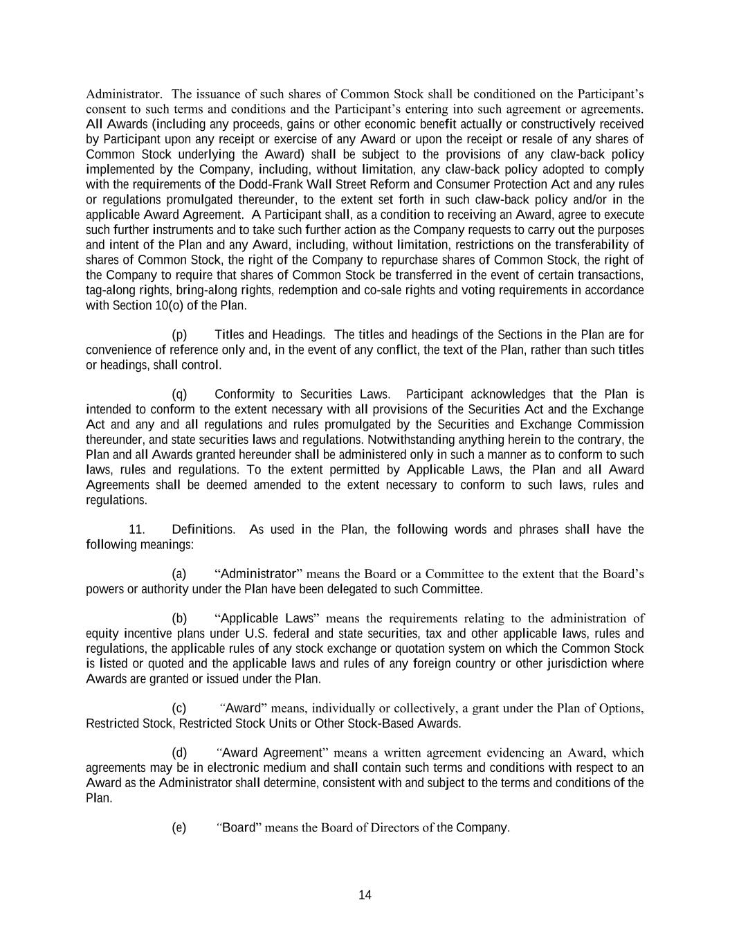 14 Administrator. The issuance of such shares of Common Stock shall be conditioned on the Participant’s consent to such terms and conditions and the Participant’s entering into such agreement or agreements. All Awards (including any proceeds, gains or other economic benefit actually or constructively received by Participant upon any receipt or exercise of any Award or upon the receipt or resale of any shares of Common Stock underlying the Award) shall be subject to the provisions of any claw-back policy implemented by the Company, including, without limitation, any claw-back policy adopted to comply with the requirements of the Dodd-Frank Wall Street Reform and Consumer Protection Act and any rules or regulations promulgated thereunder, to the extent set forth in such claw-back policy and/or in the applicable Award Agreement. A Participant shall, as a condition to receiving an Award, agree to execute such further instruments and to take such further action as the Company requests to carry out the purposes and intent of the Plan and any Award, including, without limitation, restrictions on the transferability of shares of Common Stock, the right of the Company to repurchase shares of Common Stock, the right of the Company to require that shares of Common Stock be transferred in the event of certain transactions, tag-along rights, bring-along rights, redemption and co-sale rights and voting requirements in accordance with Section 10(o) of the Plan. (p) Titles and Headings. The titles and headings of the Sections in the Plan are for convenience of reference only and, in the event of any conflict, the text of the Plan, rather than such titles or headings, shall control. (q) Conformity to Securities Laws. Participant acknowledges that the Plan is intended to conform to the extent necessary with all provisions of the Securities Act and the Exchange Act and any and all regulations and rules promulgated by the Securities and Exchange Commission thereunder, and state securities laws and regulations. Notwithstanding anything herein to the contrary, the Plan and all Awards granted hereunder shall be administered only in such a manner as to conform to such laws, rules and regulations. To the extent permitted by Applicable Laws, the Plan and all Award Agreements shall be deemed amended to the extent necessary to conform to such laws, rules and regulations. 11. Definitions. As used in the Plan, the following words and phrases shall have the following meanings: (a) “Administrator” means the Board or a Committee to the extent that the Board’s powers or authority under the Plan have been delegated to such Committee. (b) “Applicable Laws” means the requirements relating to the administration of equity incentive plans under U.S. federal and state securities, tax and other applicable laws, rules and regulations, the applicable rules of any stock exchange or quotation system on which the Common Stock is listed or quoted and the applicable laws and rules of any foreign country or other jurisdiction where Awards are granted or issued under the Plan. (c) “Award” means, individually or collectively, a grant under the Plan of Options, Restricted Stock, Restricted Stock Units or Other Stock-Based Awards. (d) “Award Agreement” means a written agreement evidencing an Award, which agreements may be in electronic medium and shall contain such terms and conditions with respect to an Award as the Administrator shall determine, consistent with and subject to the terms and conditions of the Plan. (e) “Board” means the Board of Directors of the Company.