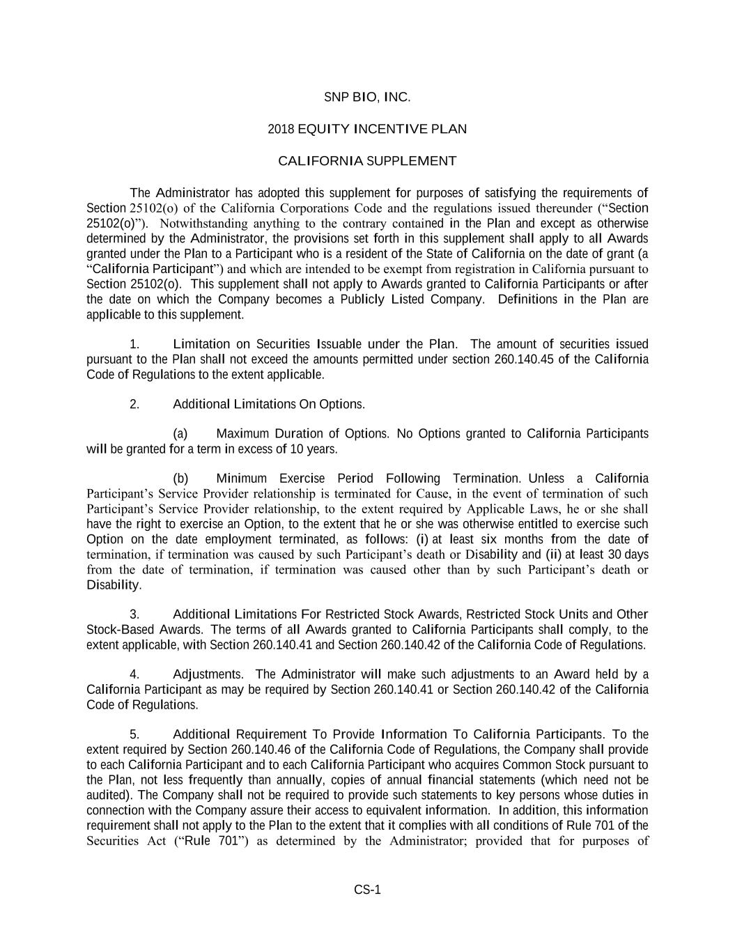 CS-1 SNP BIO, INC. 2018 EQUITY INCENTIVE PLAN CALIFORNIA SUPPLEMENT The Administrator has adopted this supplement for purposes of satisfying the requirements of Section 25102(o) of the California Corporations Code and the regulations issued thereunder (“Section 25102(o)”). Notwithstanding anything to the contrary contained in the Plan and except as otherwise determined by the Administrator, the provisions set forth in this supplement shall apply to all Awards granted under the Plan to a Participant who is a resident of the State of California on the date of grant (a “California Participant”) and which are intended to be exempt from registration in California pursuant to Section 25102(o). This supplement shall not apply to Awards granted to California Participants or after the date on which the Company becomes a Publicly Listed Company. Definitions in the Plan are applicable to this supplement. 1. Limitation on Securities Issuable under the Plan. The amount of securities issued pursuant to the Plan shall not exceed the amounts permitted under section 260.140.45 of the California Code of Regulations to the extent applicable. 2. Additional Limitations On Options. (a) Maximum Duration of Options. No Options granted to California Participants will be granted for a term in excess of 10 years. (b) Minimum Exercise Period Following Termination. Unless a California Participant’s Service Provider relationship is terminated for Cause, in the event of termination of such Participant’s Service Provider relationship, to the extent required by Applicable Laws, he or she shall have the right to exercise an Option, to the extent that he or she was otherwise entitled to exercise such Option on the date employment terminated, as follows: (i) at least six months from the date of termination, if termination was caused by such Participant’s death or Disability and (ii) at least 30 days from the date of termination, if termination was caused other than by such Participant’s death or Disability. 3. Additional Limitations For Restricted Stock Awards, Restricted Stock Units and Other Stock-Based Awards. The terms of all Awards granted to California Participants shall comply, to the extent applicable, with Section 260.140.41 and Section 260.140.42 of the California Code of Regulations. 4. Adjustments. The Administrator will make such adjustments to an Award held by a California Participant as may be required by Section 260.140.41 or Section 260.140.42 of the California Code of Regulations. 5. Additional Requirement To Provide Information To California Participants. To the extent required by Section 260.140.46 of the California Code of Regulations, the Company shall provide to each California Participant and to each California Participant who acquires Common Stock pursuant to the Plan, not less frequently than annually, copies of annual financial statements (which need not be audited). The Company shall not be required to provide such statements to key persons whose duties in connection with the Company assure their access to equivalent information. In addition, this information requirement shall not apply to the Plan to the extent that it complies with all conditions of Rule 701 of the Securities Act (“Rule 701”) as determined by the Administrator; provided that for purposes of