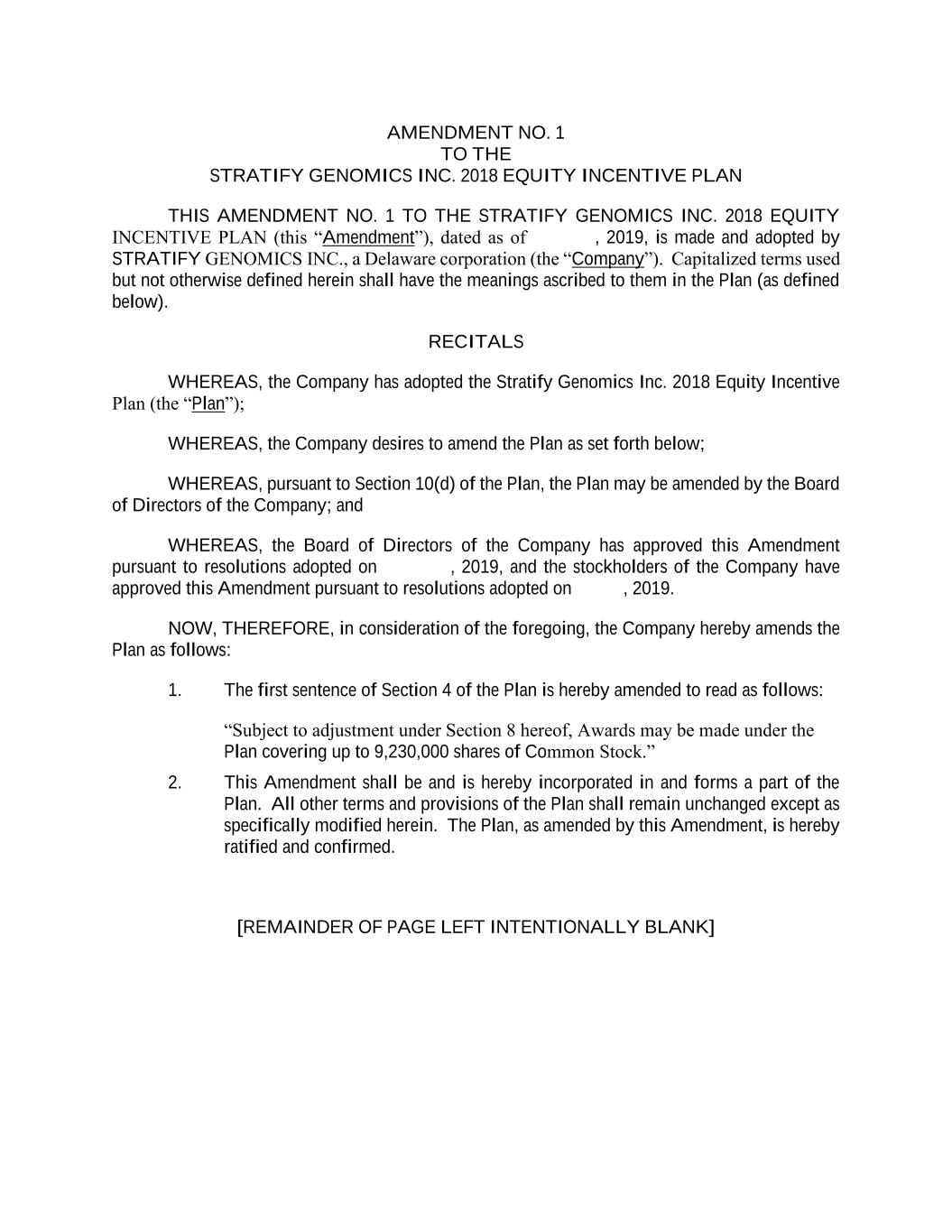 AMENDMENT NO. 1 TO THE STRATIFY GENOMICS INC. 2018 EQUITY INCENTIVE PLAN THIS AMENDMENT NO. 1 TO THE STRATIFY GENOMICS INC. 2018 EQUITY INCENTIVE PLAN (this “Amendment”), dated as of , 2019, is made and adopted by STRATIFY GENOMICS INC., a Delaware corporation (the “Company”). Capitalized terms used but not otherwise defined herein shall have the meanings ascribed to them in the Plan (as defined below). RECITALS WHEREAS, the Company has adopted the Stratify Genomics Inc. 2018 Equity Incentive Plan (the “Plan”); WHEREAS, the Company desires to amend the Plan as set forth below; WHEREAS, pursuant to Section 10(d) of the Plan, the Plan may be amended by the Board of Directors of the Company; and WHEREAS, the Board of Directors of the Company has approved this Amendment pursuant to resolutions adopted on , 2019, and the stockholders of the Company have approved this Amendment pursuant to resolutions adopted on , 2019. NOW, THEREFORE, in consideration of the foregoing, the Company hereby amends the Plan as follows: 1. The first sentence of Section 4 of the Plan is hereby amended to read as follows: “Subject to adjustment under Section 8 hereof, Awards may be made under the Plan covering up to 9,230,000 shares of Common Stock.” 2. This Amendment shall be and is hereby incorporated in and forms a part of the Plan. All other terms and provisions of the Plan shall remain unchanged except as specifically modified herein. The Plan, as amended by this Amendment, is hereby ratified and confirmed. [REMAINDER OF PAGE LEFT INTENTIONALLY BLANK]