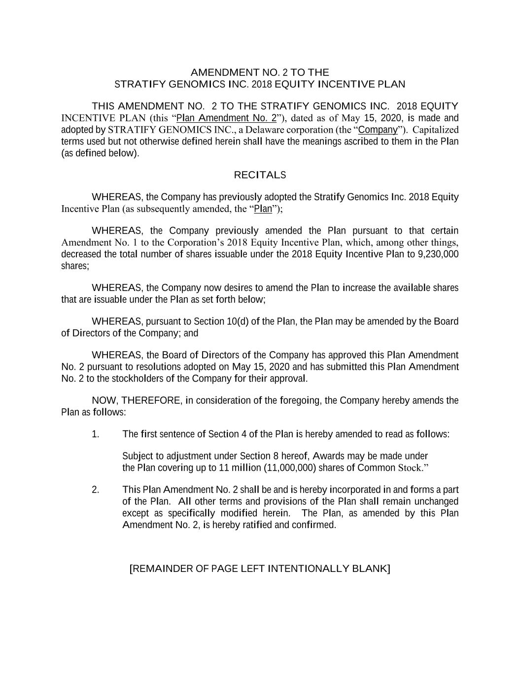 AMENDMENT NO. 2 TO THE STRATIFY GENOMICS INC. 2018 EQUITY INCENTIVE PLAN THIS AMENDMENT NO. 2 TO THE STRATIFY GENOMICS INC. 2018 EQUITY INCENTIVE PLAN (this “Plan Amendment No. 2”), dated as of May 15, 2020, is made and adopted by STRATIFY GENOMICS INC., a Delaware corporation (the “Company”). Capitalized terms used but not otherwise defined herein shall have the meanings ascribed to them in the Plan (as defined below). RECITALS WHEREAS, the Company has previously adopted the Stratify Genomics Inc. 2018 Equity Incentive Plan (as subsequently amended, the “Plan”); WHEREAS, the Company previously amended the Plan pursuant to that certain Amendment No. 1 to the Corporation’s 2018 Equity Incentive Plan, which, among other things, decreased the total number of shares issuable under the 2018 Equity Incentive Plan to 9,230,000 shares; WHEREAS, the Company now desires to amend the Plan to increase the available shares that are issuable under the Plan as set forth below; WHEREAS, pursuant to Section 10(d) of the Plan, the Plan may be amended by the Board of Directors of the Company; and WHEREAS, the Board of Directors of the Company has approved this Plan Amendment No. 2 pursuant to resolutions adopted on May 15, 2020 and has submitted this Plan Amendment No. 2 to the stockholders of the Company for their approval. NOW, THEREFORE, in consideration of the foregoing, the Company hereby amends the Plan as follows: 1. The first sentence of Section 4 of the Plan is hereby amended to read as follows: Subject to adjustment under Section 8 hereof, Awards may be made under the Plan covering up to 11 million (11,000,000) shares of Common Stock.” 2. This Plan Amendment No. 2 shall be and is hereby incorporated in and forms a part of the Plan. All other terms and provisions of the Plan shall remain unchanged except as specifically modified herein. The Plan, as amended by this Plan Amendment No. 2, is hereby ratified and confirmed. [REMAINDER OF PAGE LEFT INTENTIONALLY BLANK]