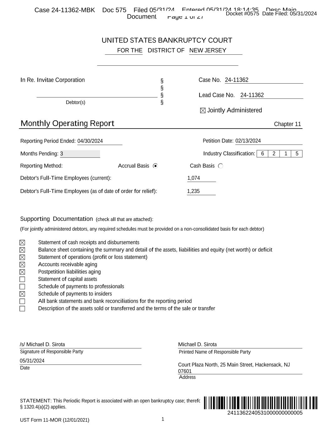 UST Form 11-MOR (12/01/2021) 1 UNITED STATES BANKRUPTCY COURT DISTRICT OFFOR THE NEW JERSEY In Re. Invitae Corporation Debtor(s) § § § § Case No. 24-11362 Lead Case No. 24-11362 Jointly Administered Monthly Operating Report Chapter 11 Reporting Period Ended: 04/30/2024 Petition Date: 02/13/2024 Months Pending: 3 Industry Classification: 6 2 1 5 Reporting Method: Accrual Basis Cash Basis Debtor's Full-Time Employees (current): 1,074 Debtor's Full-Time Employees (as of date of order for relief): 1,235 Supporting Documentation (check all that are attached): (For jointly administered debtors, any required schedules must be provided on a non-consolidated basis for each debtor) Statement of cash receipts and disbursements Balance sheet containing the summary and detail of the assets, liabilities and equity (net worth) or deficit Statement of operations (profit or loss statement) Accounts receivable aging Postpetition liabilities aging Statement of capital assets Schedule of payments to professionals Schedule of payments to insiders All bank statements and bank reconciliations for the reporting period Description of the assets sold or transferred and the terms of the sale or transfer Signature of Responsible Party Printed Name of Responsible Party Date Address /s/ Michael D. Sirota 05/31/2024 Michael D. Sirota Court Plaza North, 25 Main Street, Hackensack, NJ 07601 STATEMENT: This Periodic Report is associated with an open bankruptcy case; therefore, Paperwork Reduction Act exemption 5 C.F.R. § 1320.4(a)(2) applies. Case 24-11362-MBK Doc 575 Filed 05/31/24 Entered 05/31/24 18:14:35 Desc Main Document Page 1 of 27