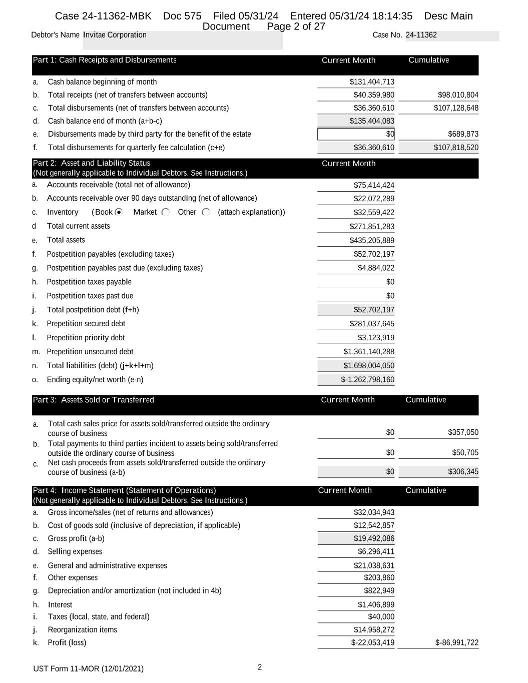 UST Form 11-MOR (12/01/2021) 2 Debtor's Name Invitae Corporation Case No. 24-11362 Part 1: Cash Receipts and Disbursements Current Month Cumulative a. Cash balance beginning of month $131,404,713 b. Total receipts (net of transfers between accounts) $40,359,980 $98,010,804 c. Total disbursements (net of transfers between accounts) $36,360,610 $107,128,648 d. Cash balance end of month (a+b-c) $135,404,083 e. Disbursements made by third party for the benefit of the estate $0 $689,873 f. Total disbursements for quarterly fee calculation (c+e) $36,360,610 $107,818,520 Part 2: Asset and Liability Status Current Month (Not generally applicable to Individual Debtors. See Instructions.) a. Accounts receivable (total net of allowance) $75,414,424 b. Accounts receivable over 90 days outstanding (net of allowance) $22,072,289 c. Inventory ( (attach explanation))Book Market Other $32,559,422 d Total current assets $271,851,283 e. Total assets $435,205,889 f. Postpetition payables (excluding taxes) $52,702,197 g. Postpetition payables past due (excluding taxes) $4,884,022 h. Postpetition taxes payable $0 i. Postpetition taxes past due $0 j. Total postpetition debt (f+h) $52,702,197 k. Prepetition secured debt $281,037,645 l. Prepetition priority debt $3,123,919 m. Prepetition unsecured debt $1,361,140,288 n. Total liabilities (debt) (j+k+l+m) $1,698,004,050 o. Ending equity/net worth (e-n) $-1,262,798,160 Part 3: Assets Sold or Transferred Current Month Cumulative a. Total cash sales price for assets sold/transferred outside the ordinary course of business $0 $357,050 b. Total payments to third parties incident to assets being sold/transferred outside the ordinary course of business $0 $50,705 c. Net cash proceeds from assets sold/transferred outside the ordinary course of business (a-b) $0 $306,345 Part 4: Income Statement (Statement of Operations) Current Month Cumulative (Not generally applicable to Individual Debtors. See Instructions.) a. Gross income/sales (net of returns and allowances) $32,034,943 b. Cost of goods sold (inclusive of depreciation, if applicable) $12,542,857 c. Gross profit (a-b) $19,492,086 d. Selling expenses $6,296,411 e. General and administrative expenses $21,038,631 f. Other expenses $203,860 g. Depreciation and/or amortization (not included in 4b) $822,949 h. Interest $1,406,899 i. Taxes (local, state, and federal) $40,000 j. Reorganization items $14,958,272 k. Profit (loss) $-22,053,419 $-86,991,722 Case 24-11362-MBK Doc 575 Filed 05/31/24 Entered 05/31/24 18:14:35 Desc Main Document Page 2 of 27