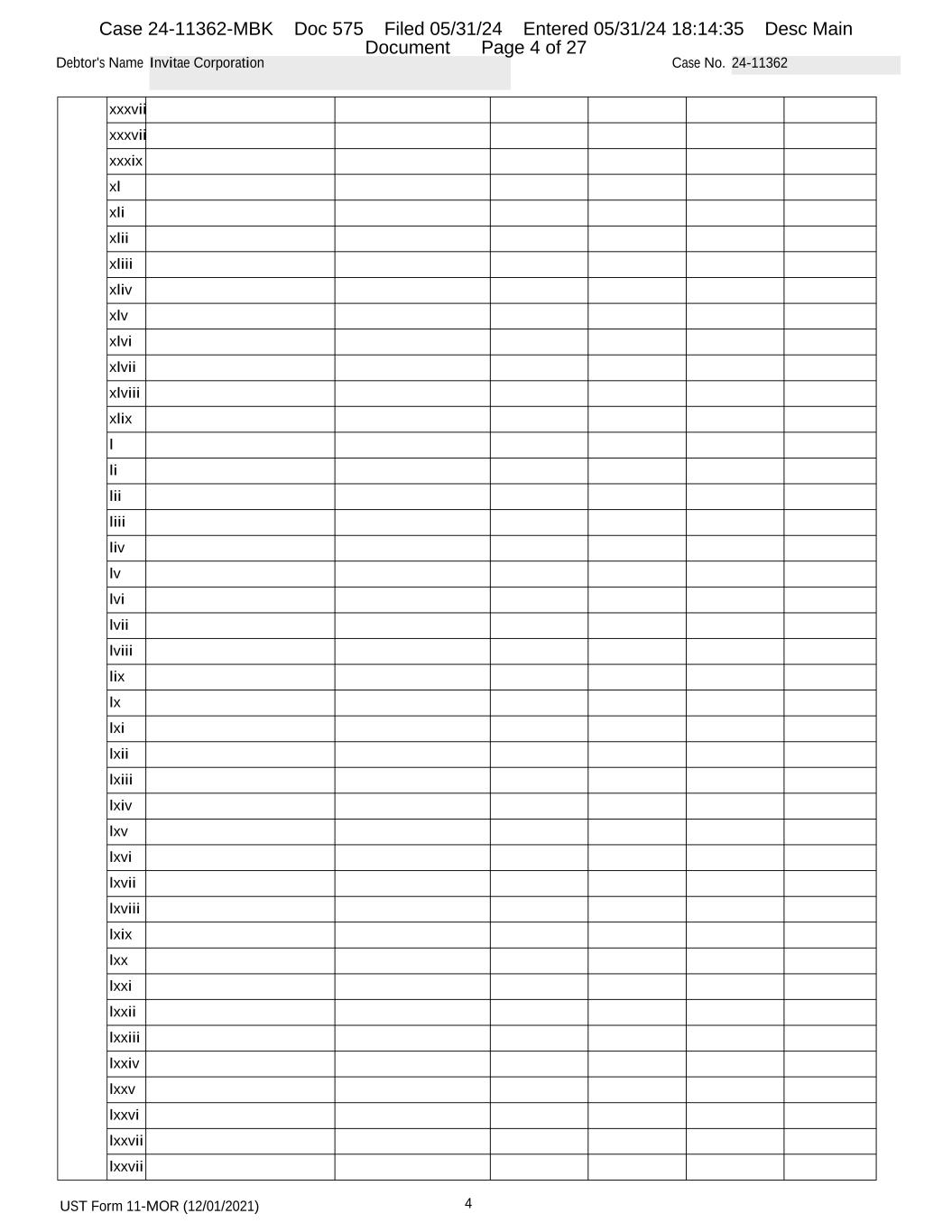 UST Form 11-MOR (12/01/2021) 4 Debtor's Name Invitae Corporation Case No. 24-11362 xxxvii xxxvii xxxix xl xli xlii xliii xliv xlv xlvi xlvii xlviii xlix l li lii liii liv lv lvi lvii lviii lix lx lxi lxii lxiii lxiv lxv lxvi lxvii lxviii lxix lxx lxxi lxxii lxxiii lxxiv lxxv lxxvi lxxvii lxxvii Case 24-11362-MBK Doc 575 Filed 05/31/24 Entered 05/31/24 18:14:35 Desc Main Document Page 4 of 27