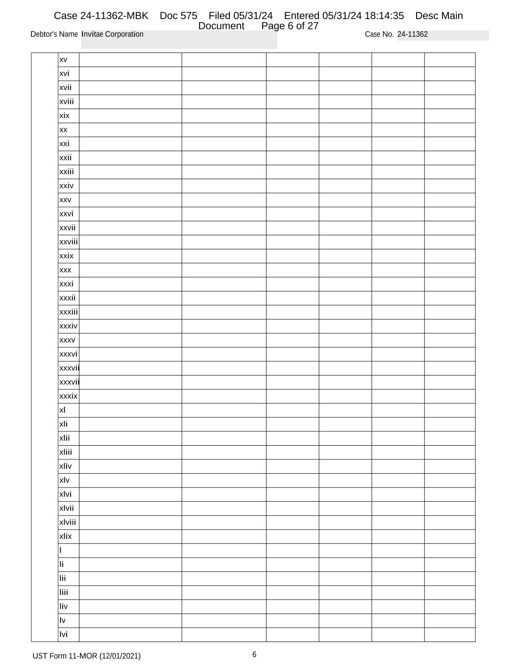 UST Form 11-MOR (12/01/2021) 6 Debtor's Name Invitae Corporation Case No. 24-11362 xv xvi xvii xviii xix xx xxi xxii xxiii xxiv xxv xxvi xxvii xxviii xxix xxx xxxi xxxii xxxiii xxxiv xxxv xxxvi xxxvii xxxvii xxxix xl xli xlii xliii xliv xlv xlvi xlvii xlviii xlix l li lii liii liv lv lvi Case 24-11362-MBK Doc 575 Filed 05/31/24 Entered 05/31/24 18:14:35 Desc Main Document Page 6 of 27