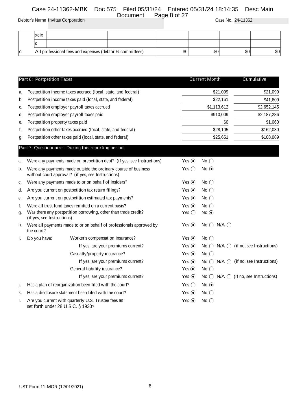 UST Form 11-MOR (12/01/2021) 8 Debtor's Name Invitae Corporation Case No. 24-11362 xcix c c. All professional fees and expenses (debtor & committees) $0 $0 $0 $0 Part 6: Postpetition Taxes Current Month Cumulative a. Postpetition income taxes accrued (local, state, and federal) $21,099 $21,099 b. Postpetition income taxes paid (local, state, and federal) $22,161 $41,809 c. Postpetition employer payroll taxes accrued $1,113,612 $2,652,145 d. Postpetition employer payroll taxes paid $910,009 $2,187,286 e. Postpetition property taxes paid $0 $1,060 f. Postpetition other taxes accrued (local, state, and federal) $28,105 $162,030 g. Postpetition other taxes paid (local, state, and federal) $25,651 $108,089 Part 7: Questionnaire - During this reporting period: a. Were any payments made on prepetition debt? (if yes, see Instructions) Yes No b. Yes NoWere any payments made outside the ordinary course of business without court approval? (if yes, see Instructions) c. Yes NoWere any payments made to or on behalf of insiders? d. Yes NoAre you current on postpetition tax return filings? e. Yes NoAre you current on postpetition estimated tax payments? f. Were all trust fund taxes remitted on a current basis? Yes No g. Yes NoWas there any postpetition borrowing, other than trade credit? (if yes, see Instructions) h. Were all payments made to or on behalf of professionals approved by the court? Yes No N/A i. Do you have: Worker's compensation insurance? Yes No If yes, are your premiums current? Yes No N/A (if no, see Instructions) Casualty/property insurance? Yes No If yes, are your premiums current? Yes No N/A (if no, see Instructions) General liability insurance? Yes No If yes, are your premiums current? Yes No N/A (if no, see Instructions) j. Has a plan of reorganization been filed with the court? Yes No k. Has a disclosure statement been filed with the court? Yes No l. Are you current with quarterly U.S. Trustee fees as set forth under 28 U.S.C. § 1930? Yes No Case 24-11362-MBK Doc 575 Filed 05/31/24 Entered 05/31/24 18:14:35 Desc Main Document Page 8 of 27