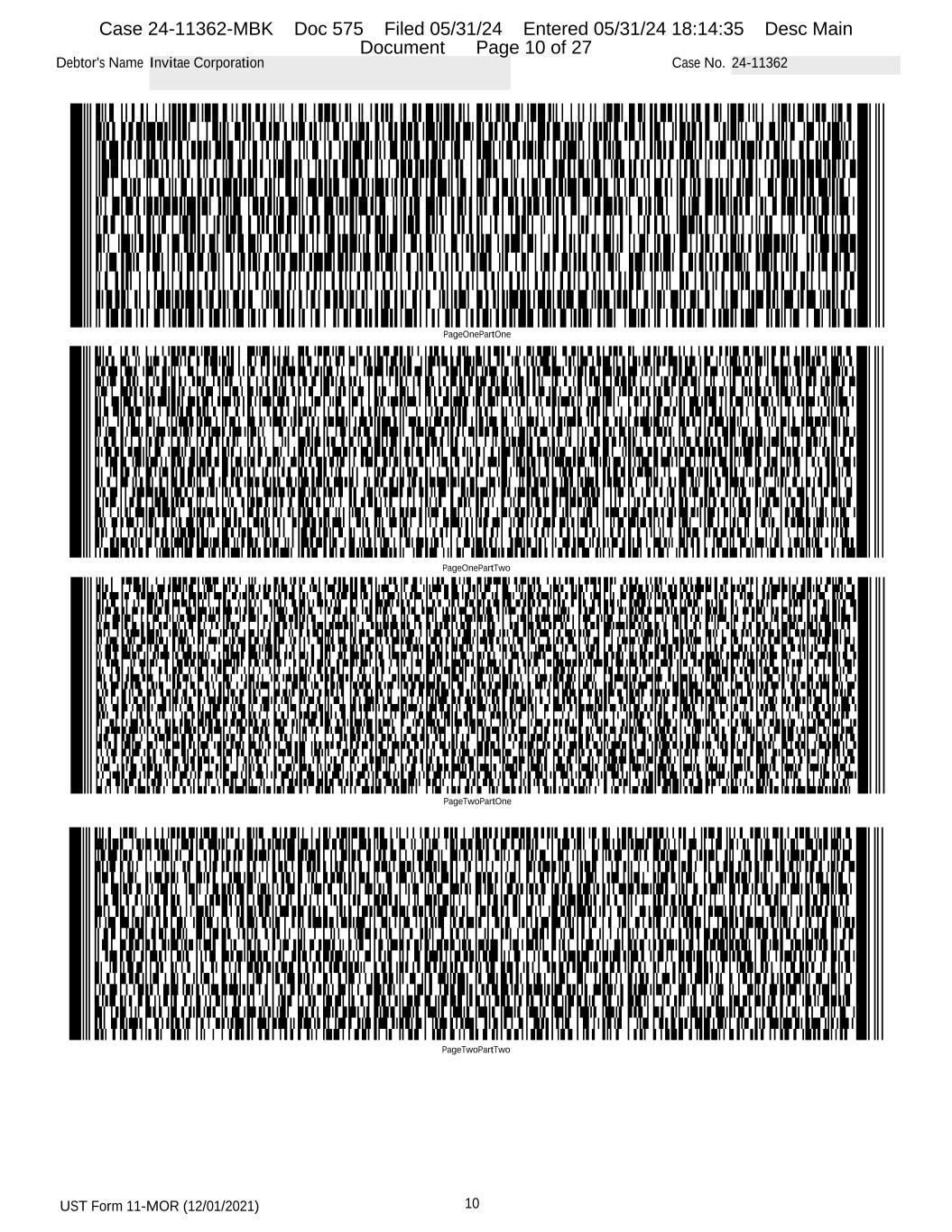 UST Form 11-MOR (12/01/2021) 10 Debtor's Name Invitae Corporation Case No. 24-11362 PageOnePartOne PageOnePartTwo PageTwoPartOne PageTwoPartTwo Case 24-11362-MBK Doc 575 Filed 05/31/24 Entered 05/31/24 18:14:35 Desc Main Document Page 10 of 27