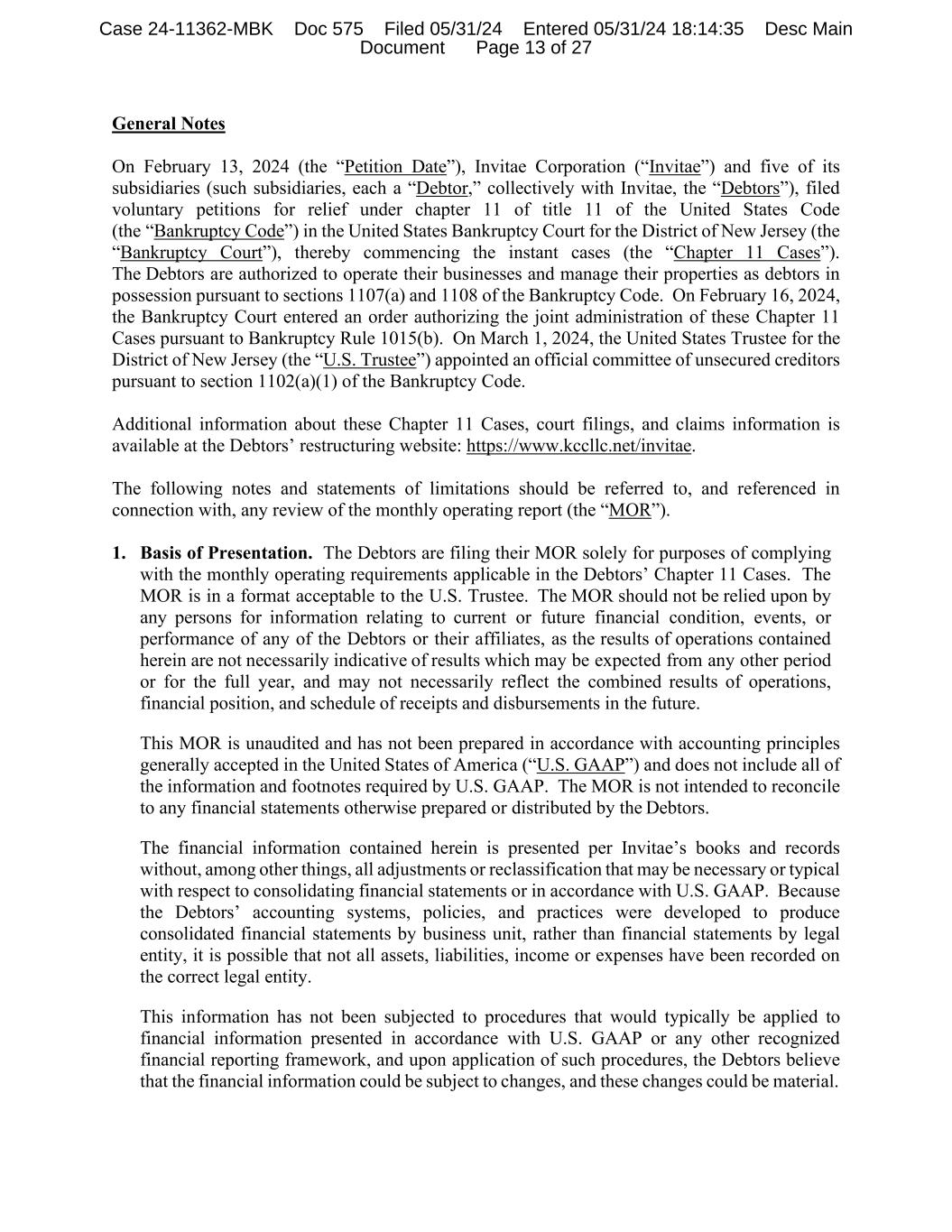 General Notes On February 13, 2024 (the “Petition Date”), Invitae Corporation (“Invitae”) and five of its subsidiaries (such subsidiaries, each a “Debtor,” collectively with Invitae, the “Debtors”), filed voluntary petitions for relief under chapter 11 of title 11 of the United States Code (the “Bankruptcy Code”) in the United States Bankruptcy Court for the District of New Jersey (the “Bankruptcy Court”), thereby commencing the instant cases (the “Chapter 11 Cases”). The Debtors are authorized to operate their businesses and manage their properties as debtors in possession pursuant to sections 1107(a) and 1108 of the Bankruptcy Code. On February 16, 2024, the Bankruptcy Court entered an order authorizing the joint administration of these Chapter 11 Cases pursuant to Bankruptcy Rule 1015(b). On March 1, 2024, the United States Trustee for the District of New Jersey (the “U.S. Trustee”) appointed an official committee of unsecured creditors pursuant to section 1102(a)(1) of the Bankruptcy Code. Additional information about these Chapter 11 Cases, court filings, and claims information is available at the Debtors’ restructuring website: https://www.kccllc.net/invitae. The following notes and statements of limitations should be referred to, and referenced in connection with, any review of the monthly operating report (the “MOR”). 1. Basis of Presentation. The Debtors are filing their MOR solely for purposes of complying with the monthly operating requirements applicable in the Debtors’ Chapter 11 Cases. The MOR is in a format acceptable to the U.S. Trustee. The MOR should not be relied upon by any persons for information relating to current or future financial condition, events, or performance of any of the Debtors or their affiliates, as the results of operations contained herein are not necessarily indicative of results which may be expected from any other period or for the full year, and may not necessarily reflect the combined results of operations, financial position, and schedule of receipts and disbursements in the future. This MOR is unaudited and has not been prepared in accordance with accounting principles generally accepted in the United States of America (“U.S. GAAP”) and does not include all of the information and footnotes required by U.S. GAAP. The MOR is not intended to reconcile to any financial statements otherwise prepared or distributed by the Debtors. The financial information contained herein is presented per Invitae’s books and records without, among other things, all adjustments or reclassification that may be necessary or typical with respect to consolidating financial statements or in accordance with U.S. GAAP. Because the Debtors’ accounting systems, policies, and practices were developed to produce consolidated financial statements by business unit, rather than financial statements by legal entity, it is possible that not all assets, liabilities, income or expenses have been recorded on the correct legal entity. This information has not been subjected to procedures that would typically be applied to financial information presented in accordance with U.S. GAAP or any other recognized financial reporting framework, and upon application of such procedures, the Debtors believe that the financial information could be subject to changes, and these changes could be material. Case 24-11362-MBK Doc 575 Filed 05/31/24 Entered 05/31/24 18:14:35 Desc Main Document Page 13 of 27